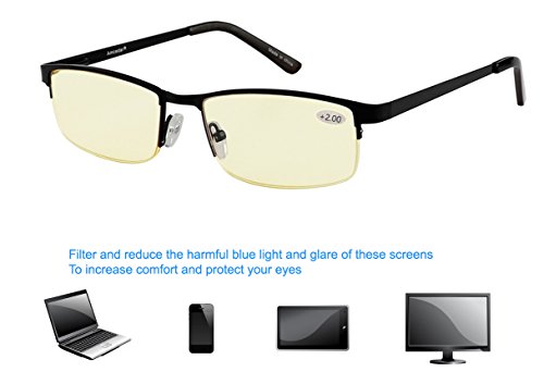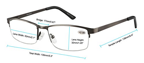 -. Feature : Reading glasses men magnification power 1.00. 2 Years Warranty And Friendly Customer Service / Stainless steel material Lightweight and Durability.The half-frame style and size fits most face shapes.Metal sP.R.Ing hinges strong and durable,help glasses adapt to face wear comfortable,Adjustable nose pads for added comfort.Great manufacturing quality and P.R.Ice / Aspherical wear-resistant lens use high-quality acrylic material,to protect the eyes in reading will not be discomfort.Package includes 4 pairs clear lens and a pair of blue light blocking reader glasses,for frequent use computer,TV,Tablet or mobile phone,Block harmful blue light to protect the eyes / Each pair reader glasses carefully selected to ensure quality,for provide a good buyer experience.Package includes 5 pairs exquisite cloth pouch for storage and protection.5 Colors(Black , Metal Gray, Brown, Gold and computer reading glasses) / Product Size, Lens Width: 53mm/2.1", Lens Height: 32mm/1.25", Bridge: 17mm/0.67", Temple Length: 138mm/5.4", Total Width: 135mm/5.3". Weight: 1ounce/25g