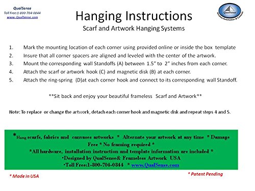 Studio : QualSense Publisher : QualSense Binding : Health and Beauty Product Description Replace and or Repair damaged parts for QualSense Scarf and Artwork hanging system (Order parts replacement kit only) ***Frameless system for Hanging artworks, fabric, pictures and scarfs. Regularly used to hang Hermes, Valentino, Gucci, DG or any other scarfs and Ideal for hanging any artwork or picture (e.g., posters, canvas prints, etc.). Damage free and Easy to hang change or replace scarf and or artworks * All hardware and installation instruction included * High Quality Professionally designed and manufactured in USA Designed by Framelessartwork a Trademark of QualSense GAriGrid USA. Patent Pending 0