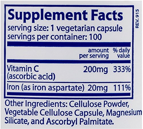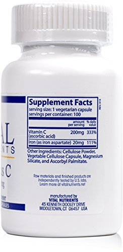 -. Binding : Health and Beauty -. Brand : Vital Nutrients -. EAN : 0693465315118 -. Feature : Maintain body stores of iron / Vitamin C improves intestinal absorption of iron / Supports red blood cell production / Does not contain coatings, binders, gluten (wheat, rye, barley)*, milk/dairy (casein, whey)*, soy protein*, egg protein*, sugar. *Verified by independent testing -. IsAdultProduct : 0 -. Label : Vital Nutrients -. LegalDisclaimer : This is a statement of nutritional support. This statement has not been evaluated by the Food & Drug Administration. This product is not intended to diagnose, treat, cure or prevent any diseases. -. Manufacturer : Vital Nutrients -. MPN : VNIC -. NumberOfItems : 1 -. PackageQuantity : 1 -. PartNumber : VNIC -. ProductGroup : Health and Beauty -. ProductTypeName : HEALTH_PERSONAL_CARE -. PublicationDate : 2015-07-17 -. Publisher : Vital Nutrients -. ReleaseDate : 2015-07-14 -. Size : 100 VegiCaps -. Studio : Vital Nutrients -. Title : Vital Nutrients - Iron Plus C (20 mg/200 mg) - Supports Healthy Cognition and Energy Levels - 100 Capsules -. UPC : 693465315118