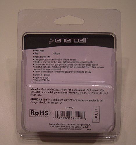 -. Binding : Wireless Phone Accessory -. Brand : Enercell -. Feature : Charges most dockable iPod and iPhone models / Coiled 30-pin cable reduces clutter yet can reach up to 6 feet (1.82m) to make connections more convenient / Simultaneously charges a second device using the additional USB port / Shows when adapter is receiving power by illuminating an LED / Works in any vehicle that has a lighter socket or accessory outlet -. Label : Enercell -. Manufacturer : Enercell -. Model : 4104147 -. MPN : 4104147 -. PackageQuantity : 1 -. PartNumber : 4104147 -. ProductGroup : Wireless -. ProductTypeName : WIRELESS_ACCESSORY -. Publisher : Enercell -. Studio : Enercell -. Title : Enercell® 5V/1A Car Charger with Fixed 30-Pin Connector for iPhone