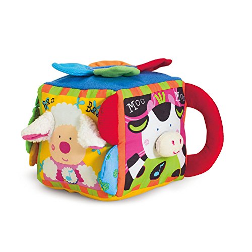 -. Feature : Musical Developmental Cube / Press the animals' noses to hear animal sounds and 4 lively melodies / Great for these skills: sensory, fine motor, gross motor, logical, creative, linguistic, emotional, communication, self-esteem / Set includes: One (1) cube with a sturdy teether, knotted tags, crinkly flower petals and tabs, and a toddler-tough plastic mirror / Materials: Fabric, foam, plastic