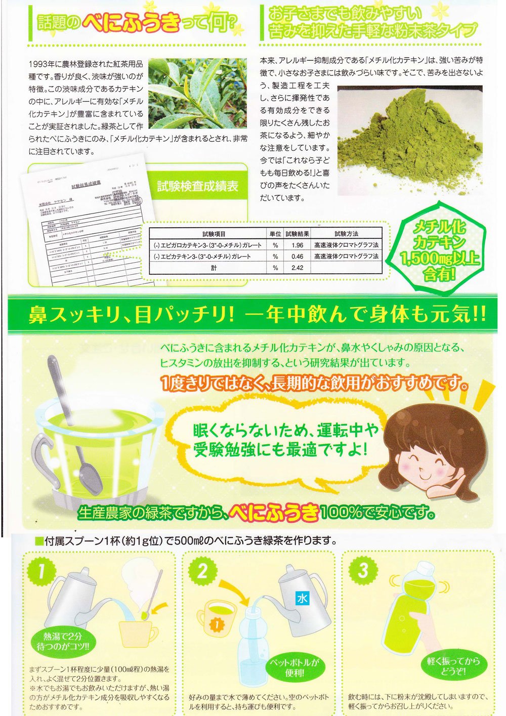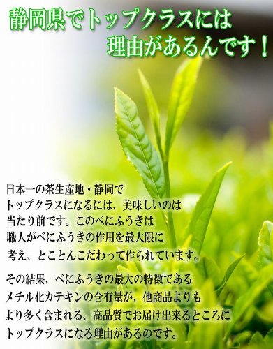 - ◆静岡産べにふうき100%!このべにふうきは、職人がべにふうきの作用を最大限に考え、土作りからとことんこだわって作られています。その結果、べにふうきの最大の特徴であるメチル化カテキンの保有量がより多く含まれる高品質の茶葉が特徴です。