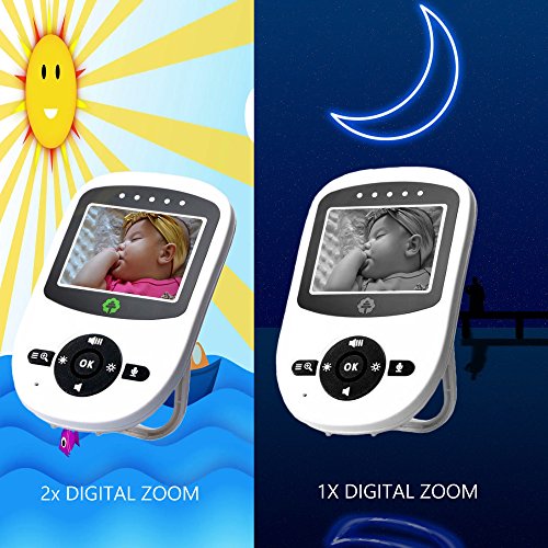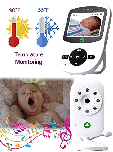 ?2.4-Inch-High Definition Color LCD Display ?2.4 GHz Wireless Audio and Video Transmission ?Secure, Non-Interrupting Connection ?Digital Pan and Tilt ?Two-Way Talk Back Feature ?Long Range Transmission, Up to 900 feet ?Out of Range Warning ?Battery Saving ECO Mode Voice Activation ?2x Digital Zoom ?Lullabies ?Auto Infrared Night Vission ?Fully Adjustable Brightness/Volume ?Room Temperature Display ?Multi-Camera Expandability ?Auto Scan View ?Alarm / Timer Setting ?Battery Level Indication with Low Battery Warning ?Intelligent Charging Li-Ion Battery ?Parent Unit with Built-in Support Stand