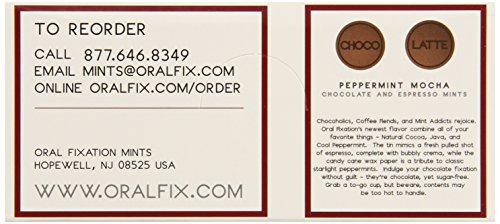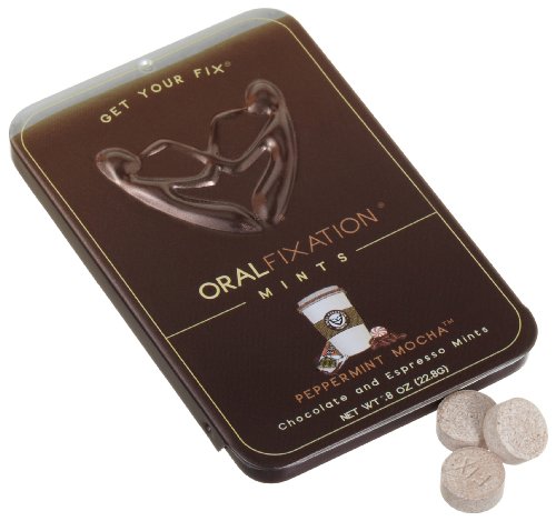 Studio : Oral Fixation Mints Publisher : Oral Fixation Mints Binding : Grocery Product Description Peppermint Mocha. The triple threat: Chocolate, coffee, and peppermint combine forces to create an axis of extreme deliciousness. P. Mocha, as it prefers to be called, delivers the caffeine jolt of a chocolate covered espresso bean cut with cooling natural mint oil. The tin mimics a fresh shot of espresso, complete with bubbly crema, while the wax paper tells of candy canes. Morning joe, afternoon indulgence, after-dinner dessert all-in-one. 0