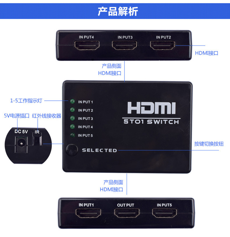 这是一款小型的高性能HDMI切换器 3进1出,它设计独特,外观精巧。3路输入同时连接到高清视频源上,输出发送高清音频/视频信号到一个高清电视上。3D视效,分辨率高达1080P,它不仅有按键循环切换,还包括了遥控切换以及手动切换,信号稳定,高清爱好者的必备良器。