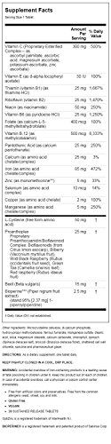 Amount Per Serving% Daily Value***Vitamin C (Proprietary Esterified Complex - as ascorbyl palmitate, ascorbic acid, magnesium ascorbate, potassium ascorbate, zinc ascorbate)300 mg500 %Vitamin E (as d-alpha tocopheryl acetate)30 IU100 %Thiamin (vitamin B-1) (as thiamine hydrochloride)25 mg1,667 %Riboflavin (vitamin B-2)25 mg1,471 %Niacin (as niacinamide)50 mg250 %Vitamin B-6 (as pyridoxine HCl25 mg1,250 %Folate (as folic acid)400 mcg100 %Vitamin B-12 (as cyanocobalamin)500 mcg8,333 %Pantothenic Acid (as calcium pantothenate)25 mg250%Calcium (as amino acid chelate/complex)25 mg3 %Iron (as amino acid chelate/complex)85 mg472 %Zinc (as monomethionine)**5 mg33 %Selenium (as amino acid complex)10 mcg14 %Copper (as amino acid chelate)2 mg100 %Manganese (as amino acid chelate/complex)5 mg250 %L-Cysteine (free form amino acid)50 mg*Proanthoplex Proprietary Proanthocyanidin/Bioflavonoid Complex Bioflavonoids (from Citrus limon exocarp), Bilberry (Vaccinium myrtillus fruit), Blackberry (Rubus villosus fruit), Green Tea (Camellia sinensis leaf), Black and Red Raspberry (Rubus idaeus fruit)25 mg*Beet (Beta vulgaris)15 mg*Bioperine*** (Piper nigrum fruit extract) (stand. 95% 2.37 mg 1-piperoylpiperidine)2.5 mg*