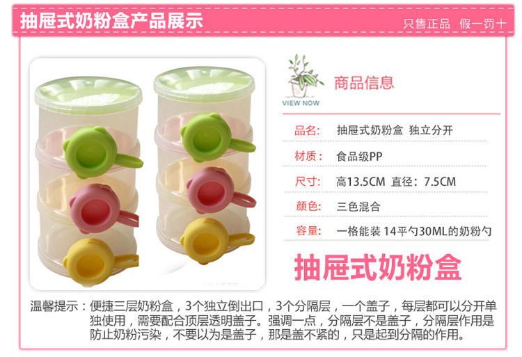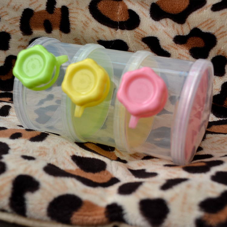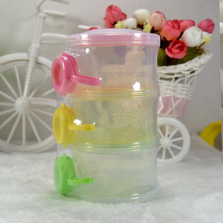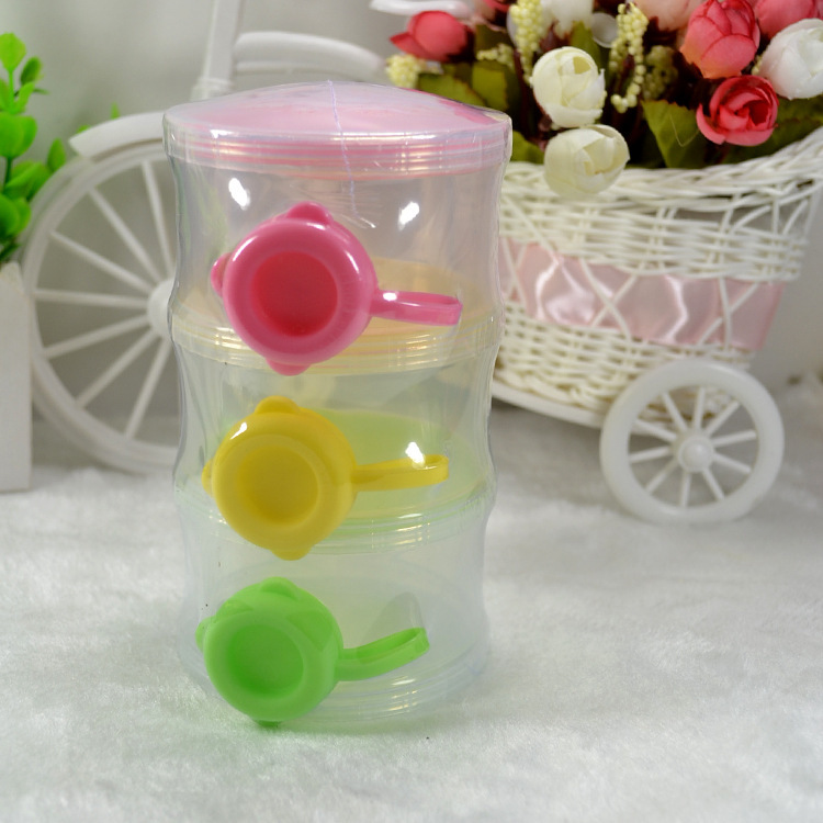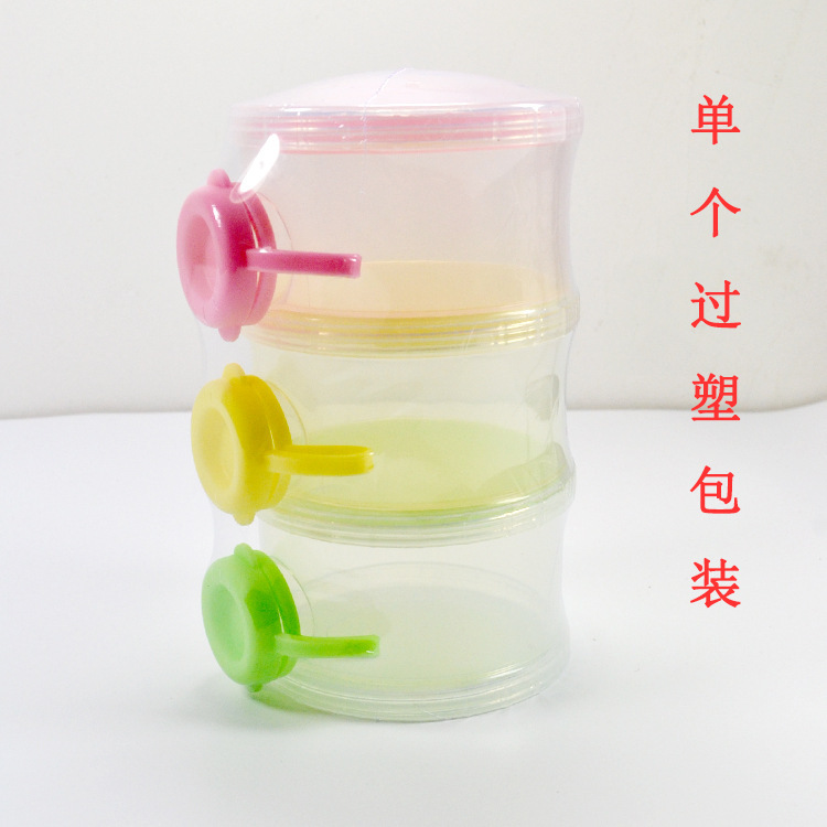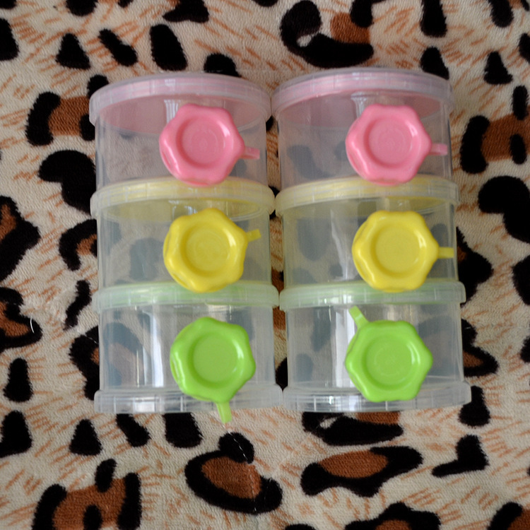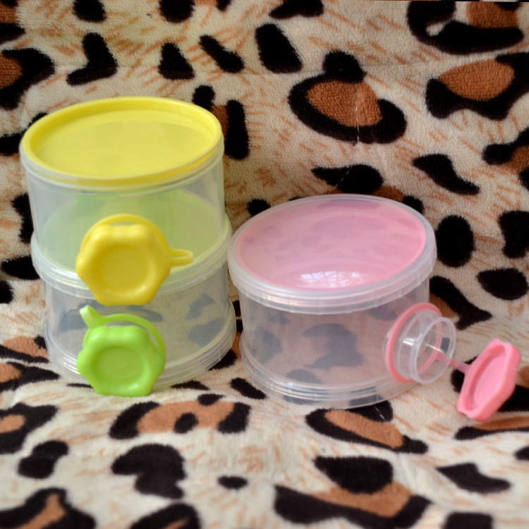 三层塑料奶粉盒,每层装的奶粉量为婴儿喝奶的一次用量,携带方便。