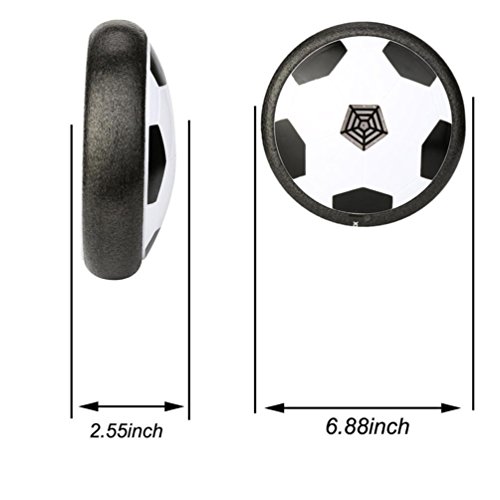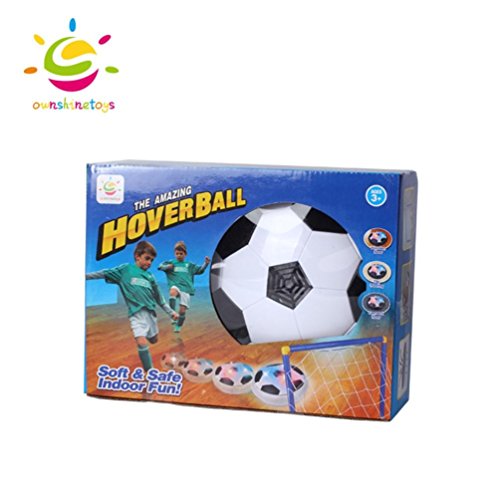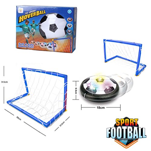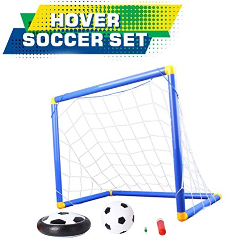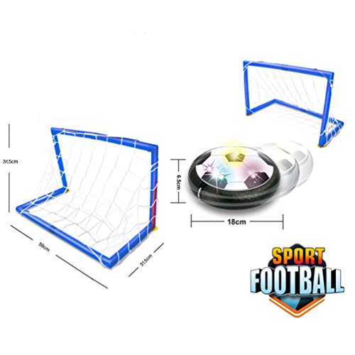 Features: Great for learning the fundamental of soccer, while improve motor skills, coordination and social skills. Easy to disassemble for storage and portability Flip goal over to adjust the height of the net Excite your future World Cup Star with this colorful kid-sized soccer set perfect for your own backyard Great for learning the fundamentals of soccer, while improving motor skills, coordination and social skills The amazing hover ball can glide over any smooth surface, and a powerful fan floats soccer, so easy for it to sail over hard surfaces You can kick it like a real soccer ball, not just a toy!You can turn any floor into an air hockey/soccer surface, perfectly at home on wood, linoleum, polished concrete, and even low-pile carpet. It also has colored light on ball surface with button, making your night game wonderful. Must be powered by 4 "AA" batteries (NOT INCLUDED). The Air Power Soccer Disk will provide hours of dynamic high-tech soccer action. The best choice for kids Birthday gift or Christmas gift. Package: 1 x Hover Ball 1 x? Inflatable Soccer Ball 1 x Air Pump 1* Portable goals (Self assembly) 0