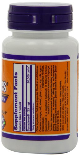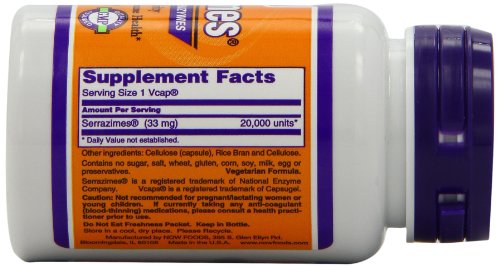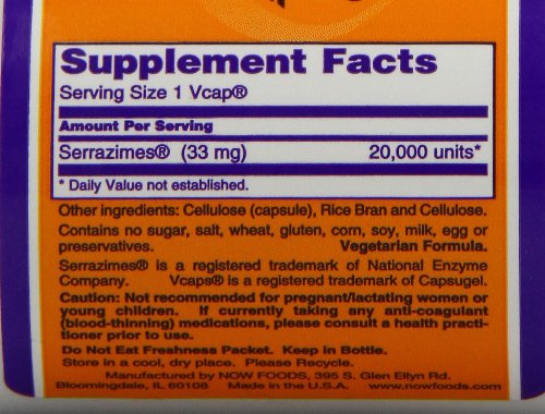 ReleaseDate : 2010-06-17 Studio : NOW Foods Publisher : NOW Foods Binding : Health and Beauty Product Description Serrazimes® is a proteolytic blend composed of enzymes derived from the edible fungi, Aspergillus oryzae and Aspergillus melleus.? Scientific studies indicate that Serrazimes may help maintain and support cardiovascular and lymphatic health through its ability to help break down excess fibrin.? Serrazimes® may also help support a healthy immune system and a healthy response to external stresses.? Serrazimes® is effective when used as directed, providing enzymatic activity equivalent to Serrapeptidate (aka, Serrapeptase).* 0