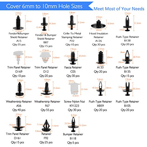 18 MOST COMMON SIZES: Don't have to go to a auto parts store for different fasteners.EZYKOO Fasteners Clips cover 6mm to 10mm hole sizes for exact OEM replacement.