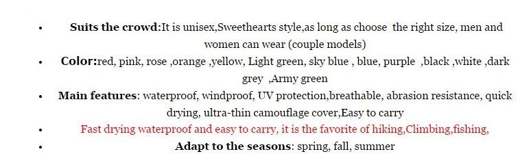 Notice: this shirt women and men, the size table are the same . it suit summer and spring season, the jacket is thin,the weight only about 150g-250g.