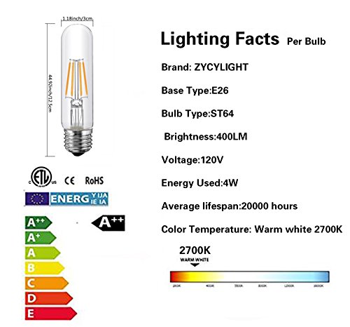 - •【Good Quality】 – Edison style LED bulb ,T10 bulb, E26 medium screw base, Dimmable Light, 120V, 400 Lumens, soft white 2700K, clear glass high light transmission, Dimension of the T10 LED bulb: L 4.9 x D 1.2 inches