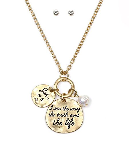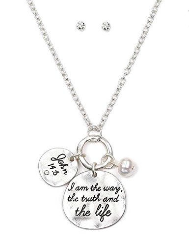 Disc charm necklace engraved with John 14:6 bible verse and a faux pearl bead