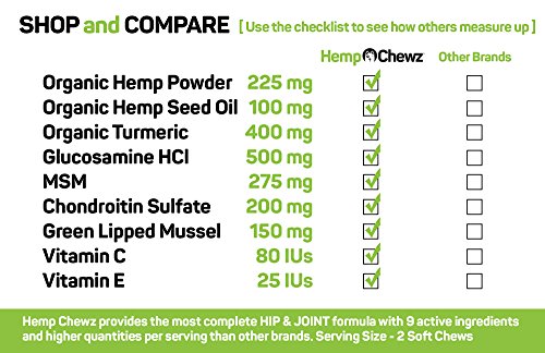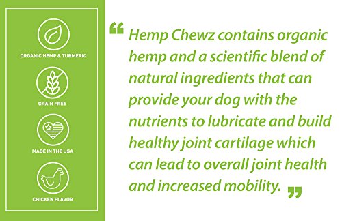 VETERINARIAN RECOMMENDED INGREDIENTS PROVEN to SUPPORT JOINT HEALTH FOR DOGS, INCREASE MOBILITY and EASE JOINT DISCOMFORT. Hemp Chewz is made with organic hemp and a scientific blend of natural ingredients that can provide your dog with the nutrients to lubricate and build healthy joint cartilage which can lead to overall joint health and increased mobility