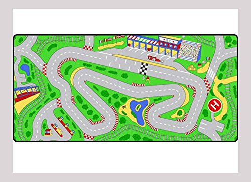 Young racing enthusiasts will adore this colorful racetrack themed carpet, featuring a track designed for hours of play with toy cars from your child's own collection. The track includes pit stops, a checkered flag finish line and bleachers of fans, and is perfect for kids who dream of racing in their own Indy 500, Unlimited Warranty. Soil and Stain Resistant Washable Carpet. Durable Latex Gel Skid-Proof Backing. 100% Nylon Carpet. Meets All ASTM F963 Safety Standards. Indoor/Outdoor Usage. Able to Withstand Rugged Wear. Highest Inflammability Rating in the industry. Award-Winning. 39 in. W x 79 in. L (5 lbs.). Junior racers will feel the thrill of the speedway as they take to the track with their own miniature-sized race cars (not included). Hugging the curves, making pit stops as necessary, and streaming down the straightaway toward the checkered flag and victory!Feature