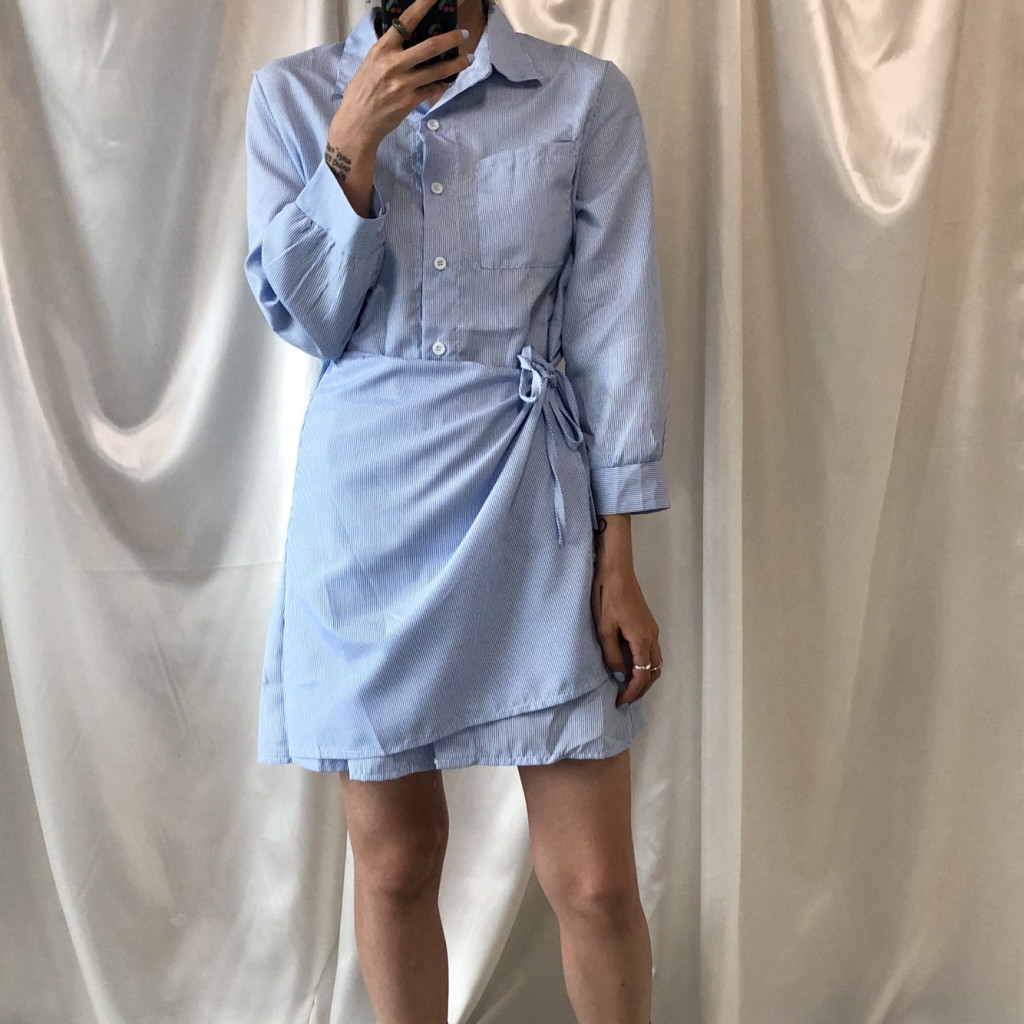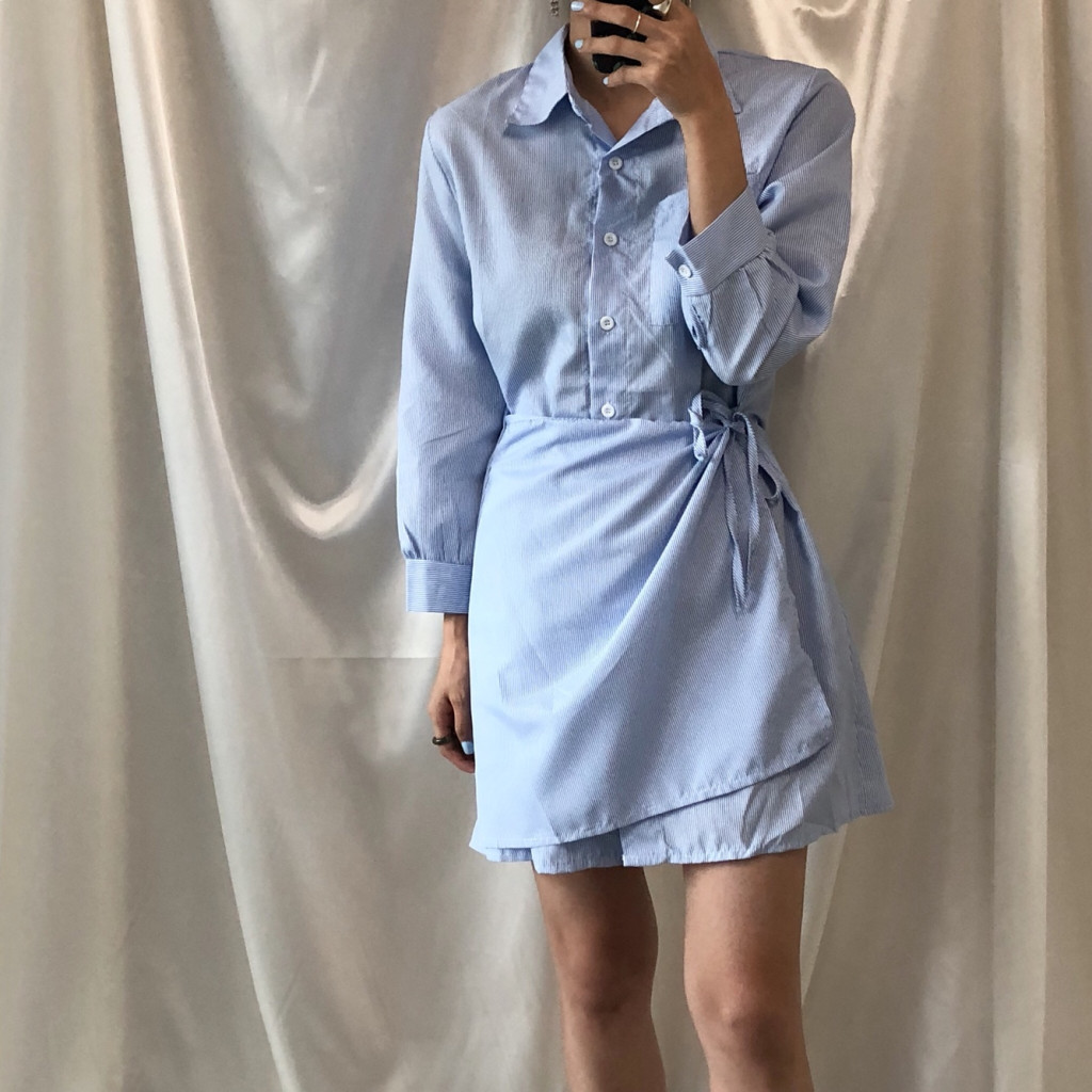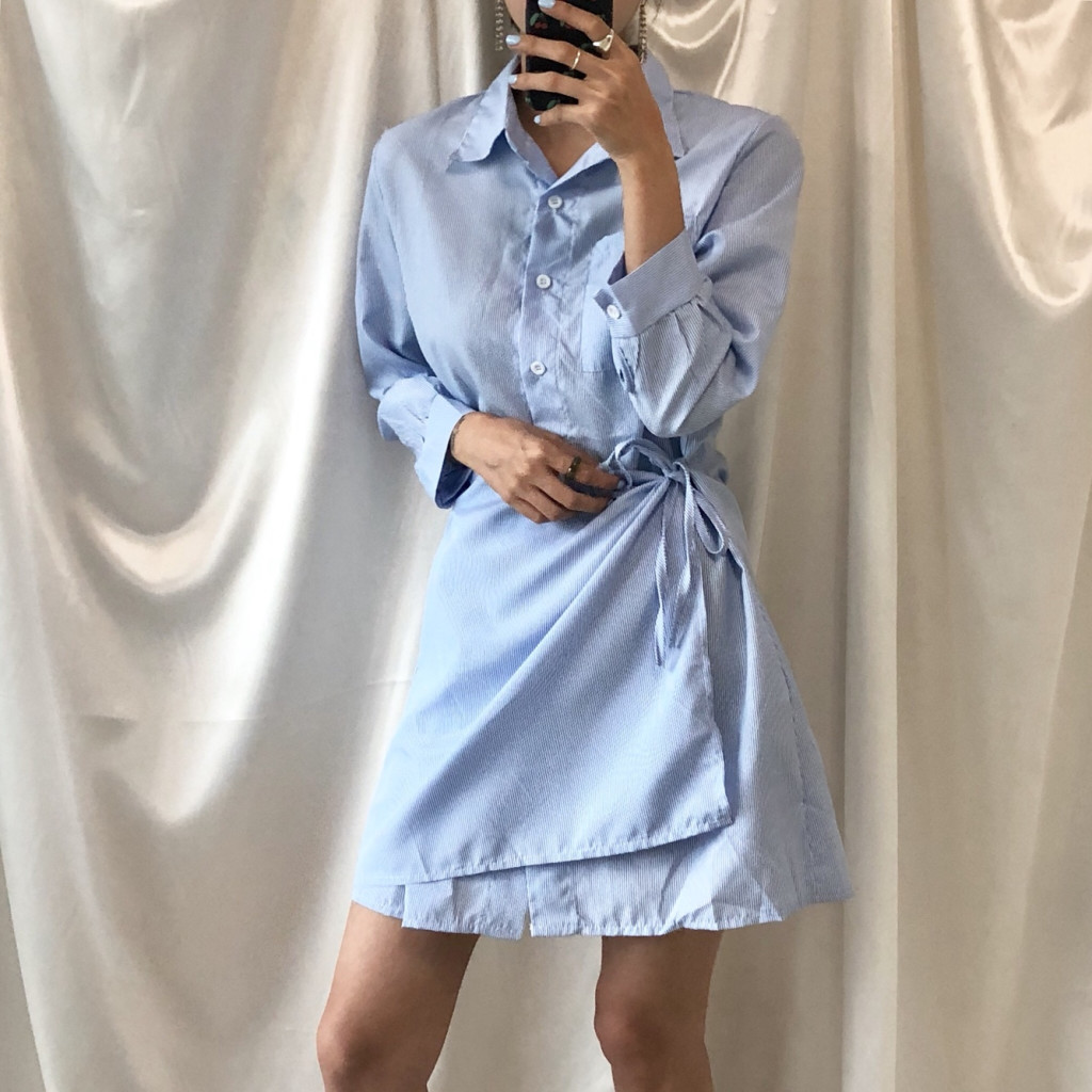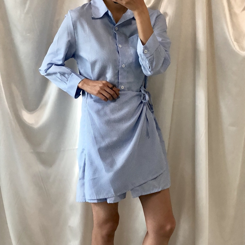 밋밋할수 있는 셔츠 원피스에 랩 포인트가 들어있어,트렌디한 무드를 주며,