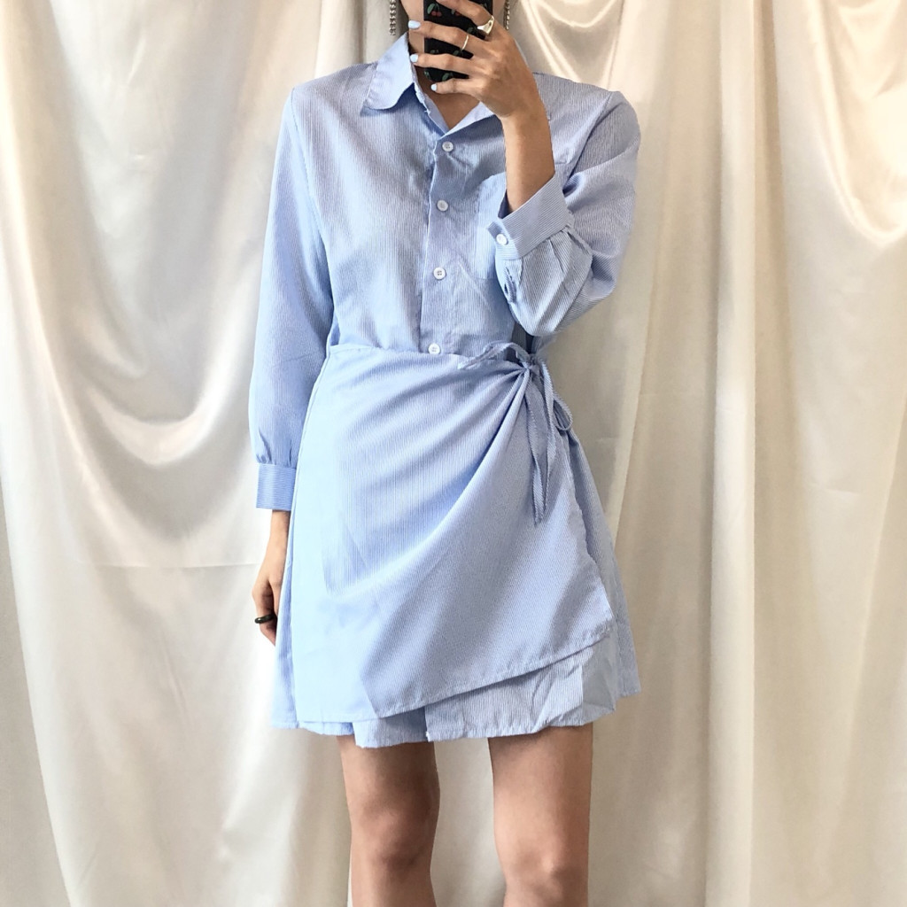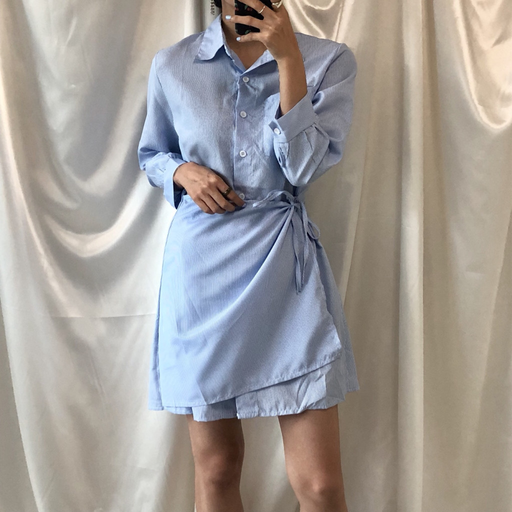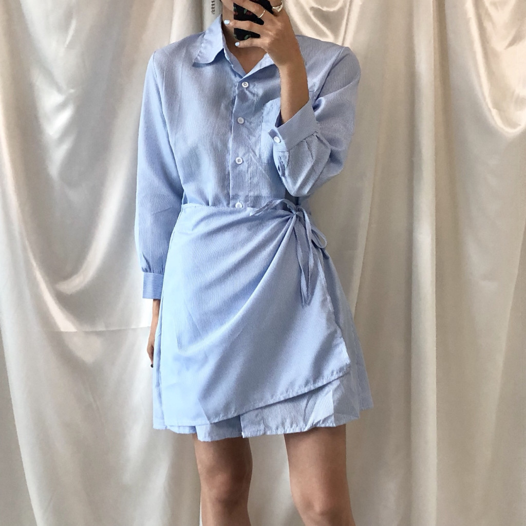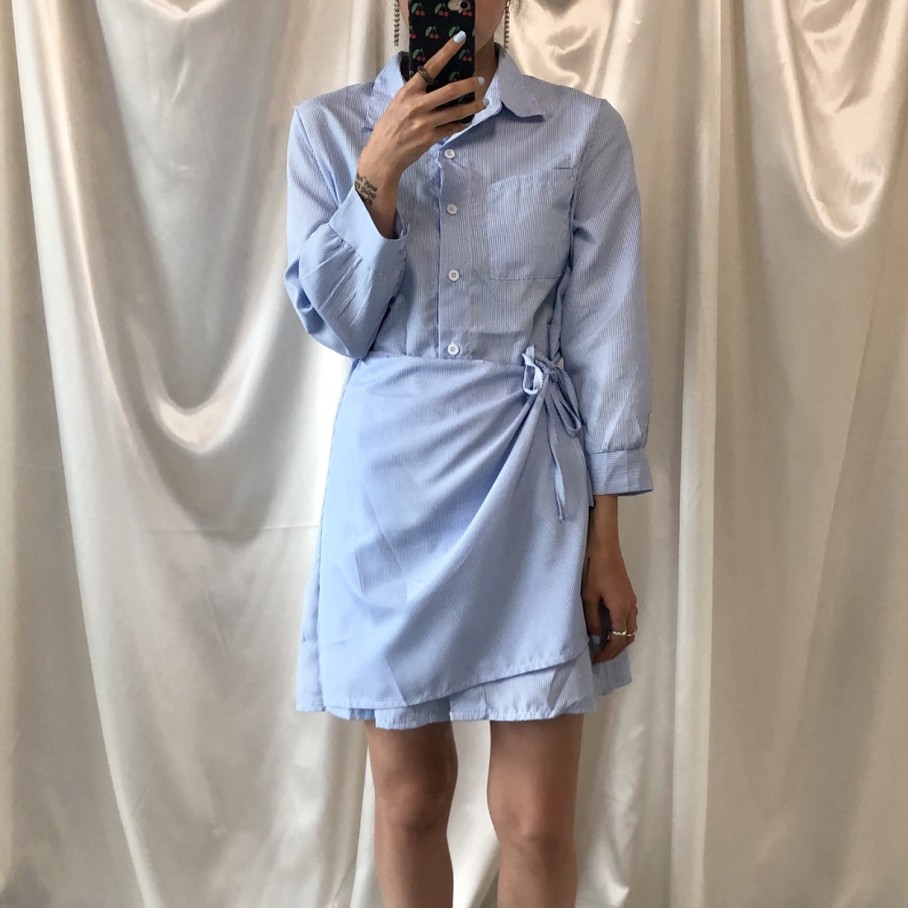 밋밋할수 있는 셔츠 원피스에 랩 포인트가 들어있어,트렌디한 무드를 주며,