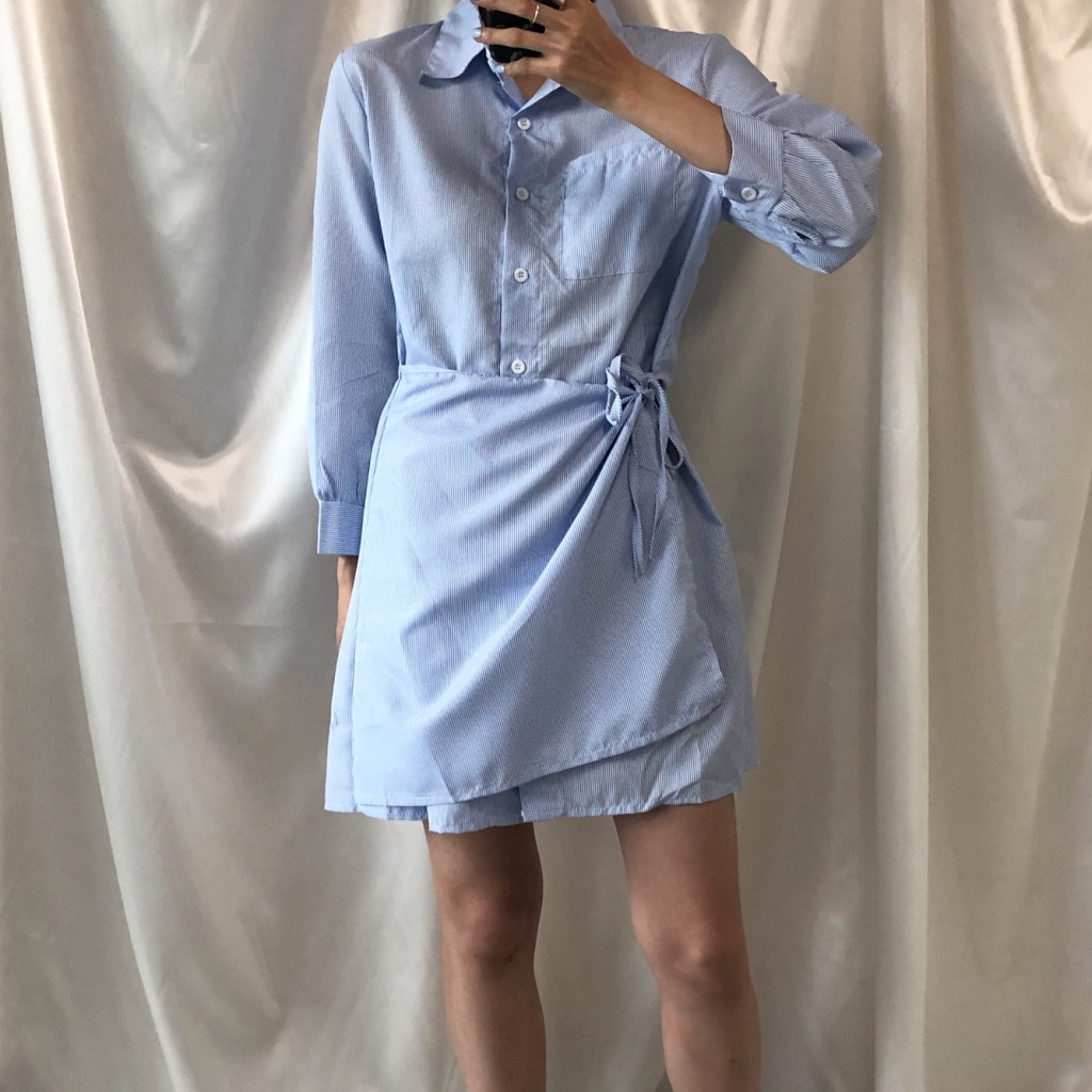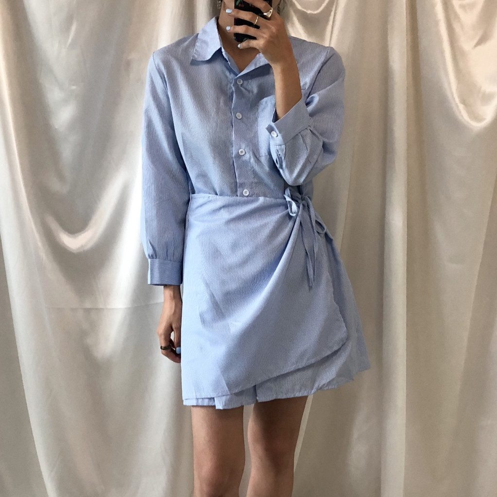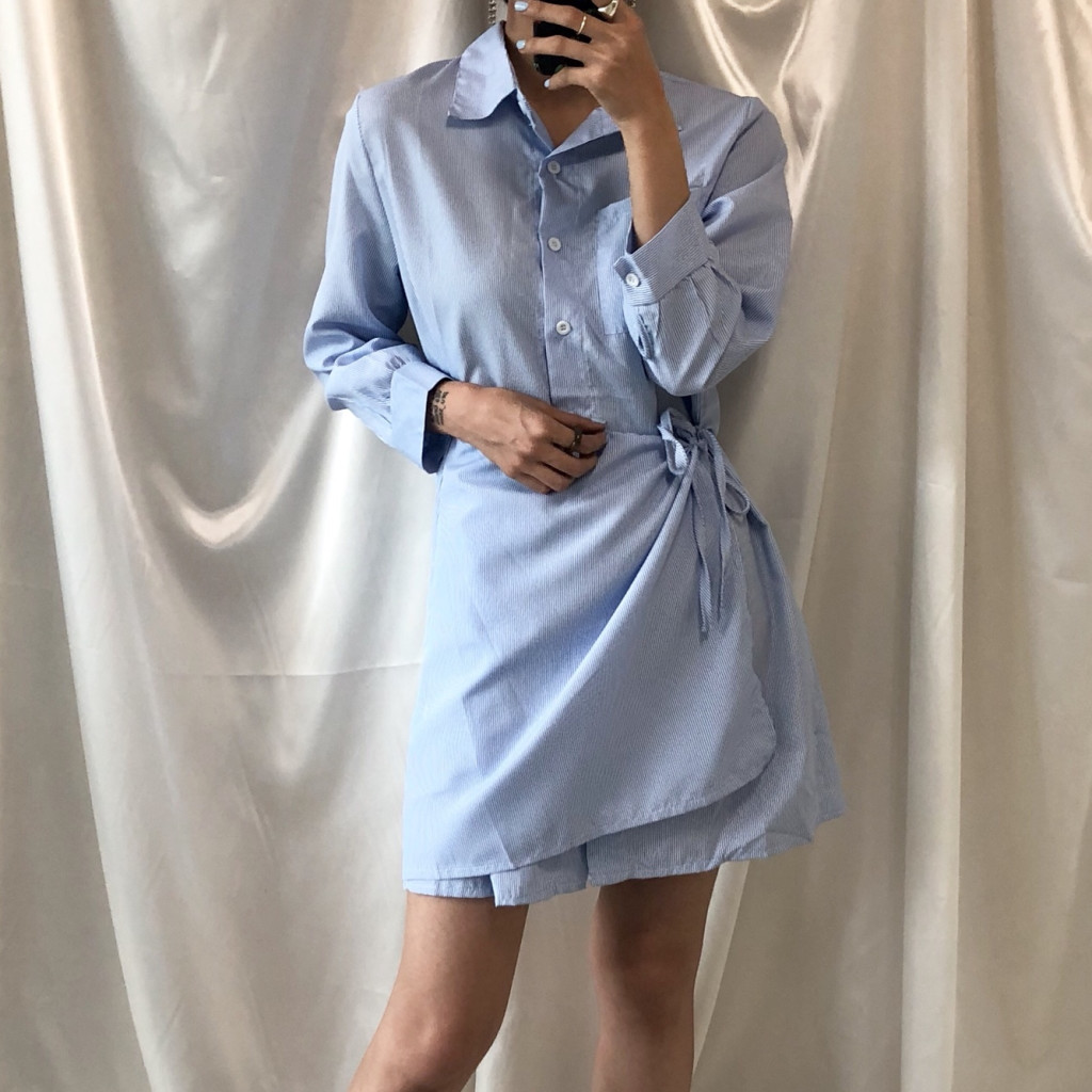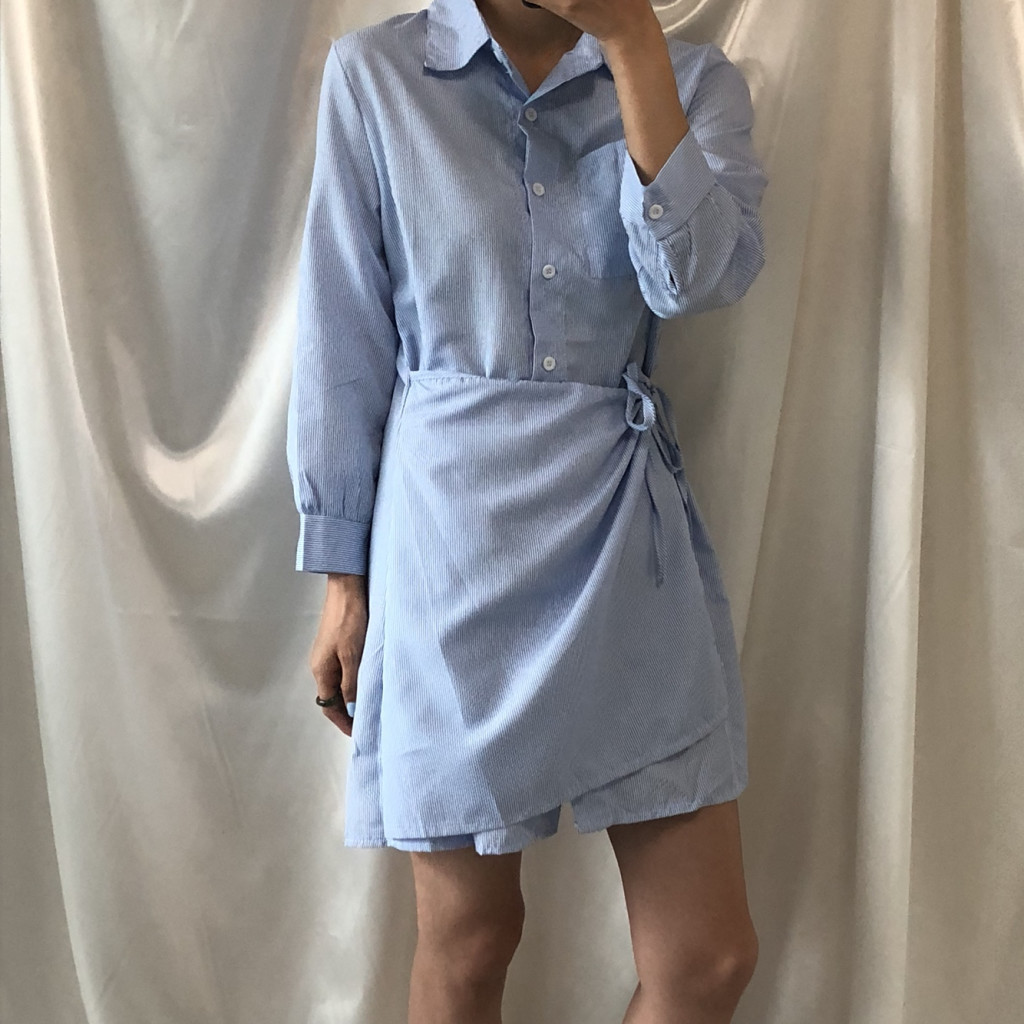깔끔한 실루엣의 스트라이프 패턴 셔츠 랩 원피스 입니다.
