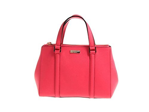 This fashionable Newbury Lane Small Loden is made of structured and durable desert rose pink saffiano finished leather with 14k light gold plated hardware. The interior is lined in custom cream and black print fabric and features a zippered pocket and two open slip pockets. It has an open top with magnetic closure as well as a fully zippered and lined wall pocket on either side of the center compartment. The front is accented with Kate Spade's logo staple and the flattened bottom panel feature (4) metal feet to protect the bottom. Dual handles have a drop of about 4.5 inches, or use the removable and adjustable shoulder and cross-body strap with a drop of about 22 inches. It measures approximately 11 inches (L) x 8 inches (H) x 4 (W). Includes a brown Kate Spade dust cover bag.Feature