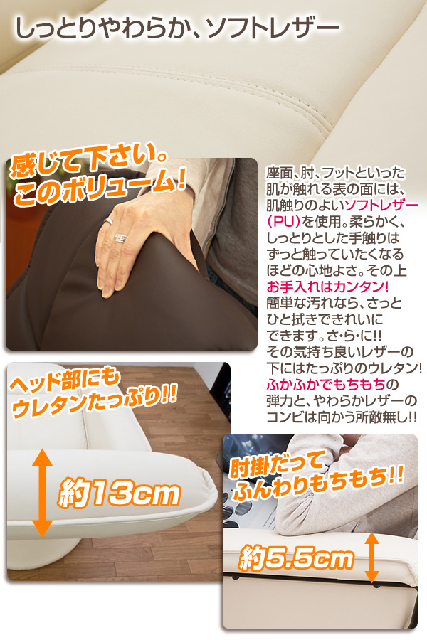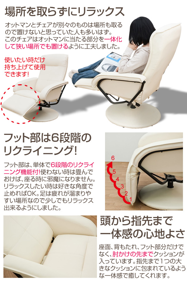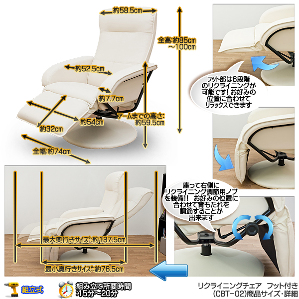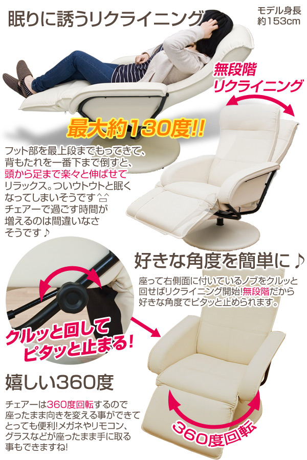本商品はお取り寄せ商品のため、稀にご注文入れ違い等により欠品・遅延となる場合がございます。誠に恐れ入りますが、何卒ご了承ください。 また、以下の場合には追加送料がかかる場合がございます。  ・大型商品の複数購入時 ・同梱区分が異なる商品の複数購入時  【出荷目安】:1 - 4営業日 ※土日・祝除く 【同梱区分】:TS 1490 【梱包サイズ】:大型商品 【代引き決済】:不可  配送伝票の依頼主は出荷元(メーカーもしくは仕入元)名となる場合がございますので、お受け取りの際はご注意ください。   【型番】cbt02  【商品名の色やサイズについて】 こちらは「リクライニングチェア フット付き ブラウン (BR)」の商品ページです。商品画像や商品情報には、色違いやサイズ違いの商品が載っている場合がございます。ご注文前に色・サイズ・セット内容のご確認をお願いいたします。  ソフトレザーで、ふんわりした座り心地を実感して下さい♪ フット6段階リクライニング機能 水平より更に上に持ち上げてロック解 除になり、下まで降ろしてから、上にあげてカチカチと音がしますので、お好きな所で止めて下さい 背もたれ無段階リクライニングは、右下の丸いノブを緩めて体重をかけて倒します お好きな位置になりましたら、丸いノブを締めると固定されます 背もたれとフット部のリクライニングは連動していません 座面は360度回転します  幅740×奥行765~1375×高さ850~1000mm 座面サイズ:幅525×奥行485mm アームまでの高さ:595mm 座面の高さ:415~440mm 重量:16kg 組立品(1梱包) 張り材:合成皮革(表面=PU・裏面=PVC) スチールパイプ ウレタンフォーム 原産国:中国  【ご注意事項】 ※本商品は、北海道・沖縄・離島への配送はいたしかねます。あらかじめご了承ください。