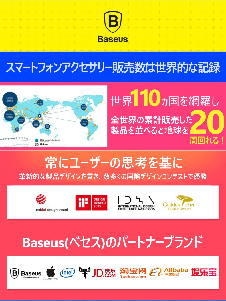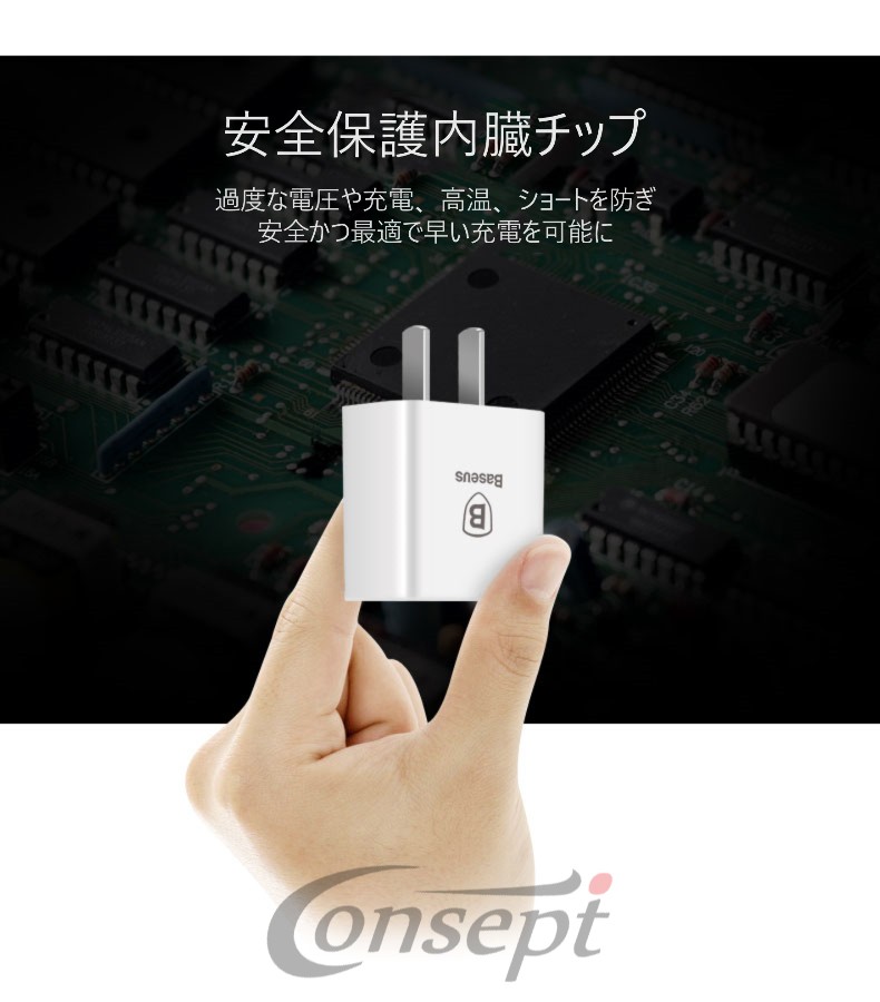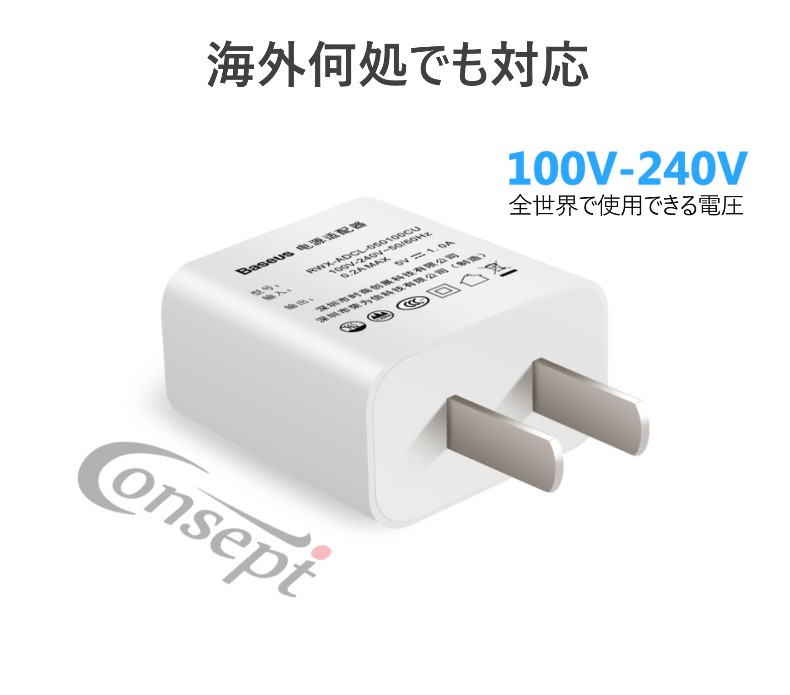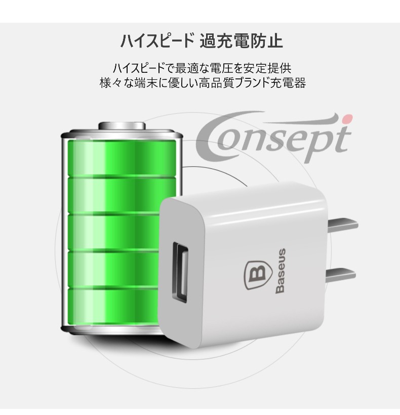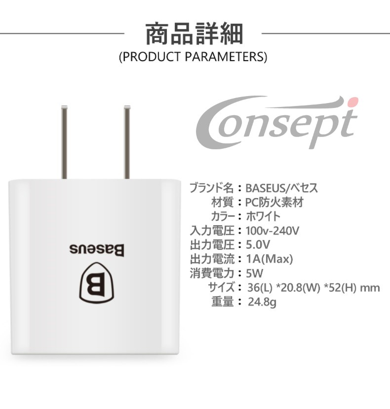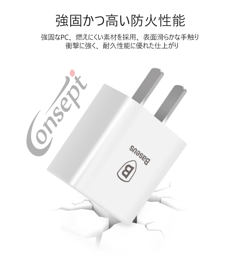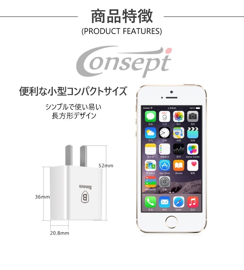 商品状態 :新品未使用ブランド名:BASEUS べセス材質 :PC防火素材入力電圧:100-240V 出力電圧:5.0V 出力電流:1A(Max)消費電力:5Wサイズ :36(L)*20.8(W)*52(H)mm重量 :24.8g対応機種:iPhone SE iPhone、iPad、iPod、スマートフォン等のUSBデバイス機器コンパクトなのに優れた性能をもつBASEUS正規品高速充電器ACアダプター。iPhone、スマートフォン、iPad、タブレット、ゲーム機器、デジタルオーディオ機器を高速充電可能。接続口は耐久性に優れ、数万回抜き差しを行ってもグラつかないよう設計されております。世界中すべての国の電圧に対応。海外でも問題なく使用可能です。安全保護チップを内蔵しているので、過度な電圧、高温、ショートの発生を防ぎます。