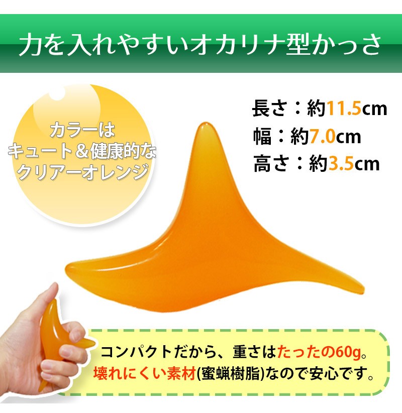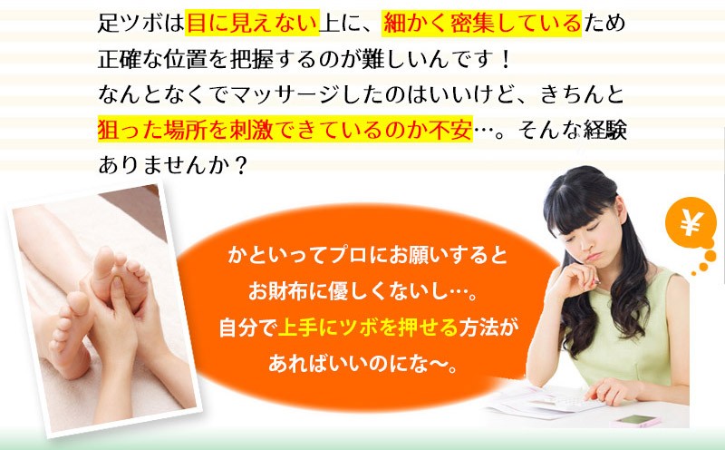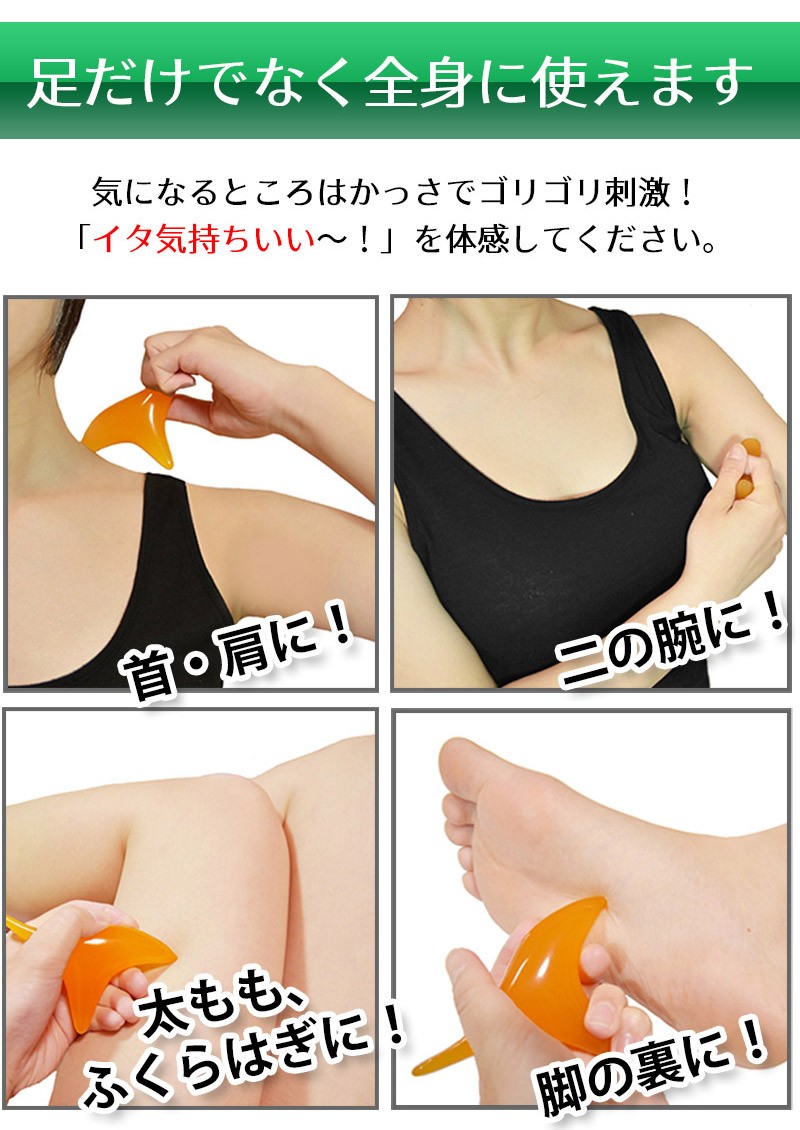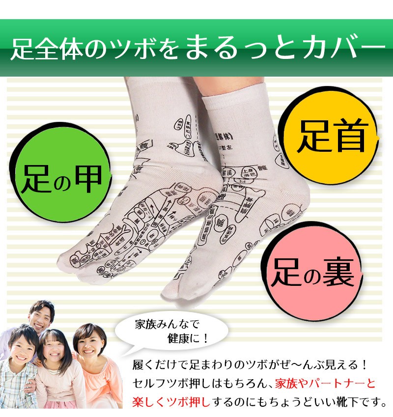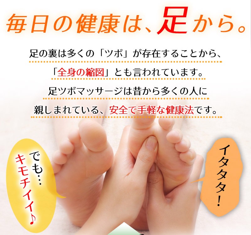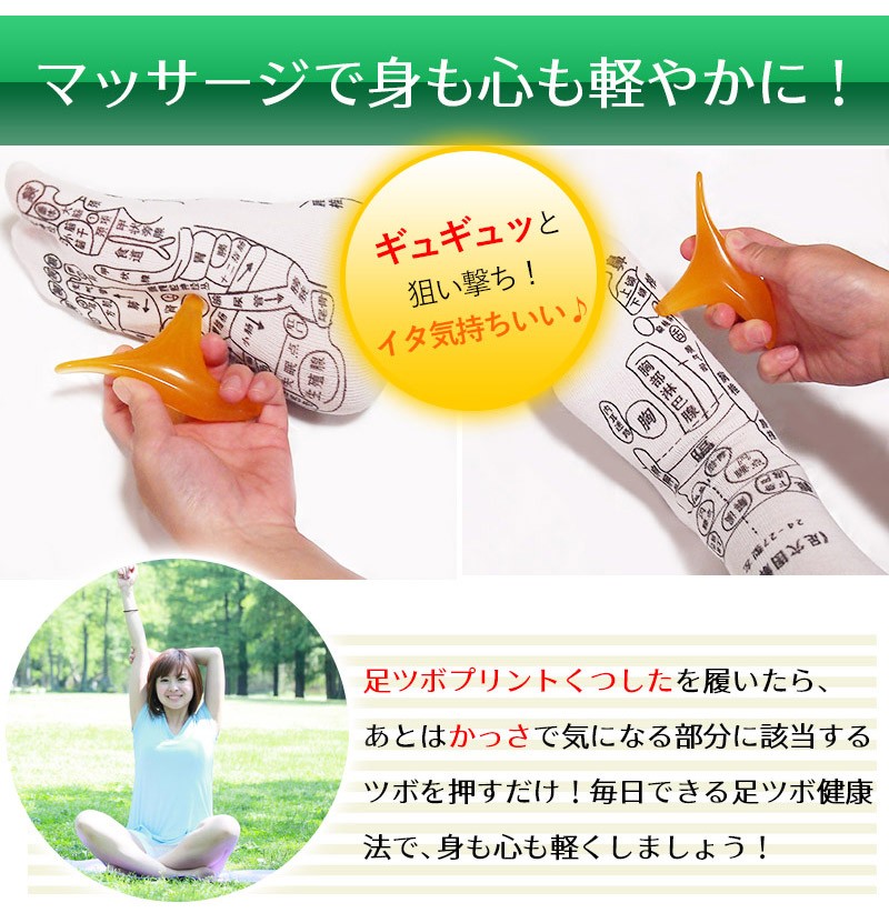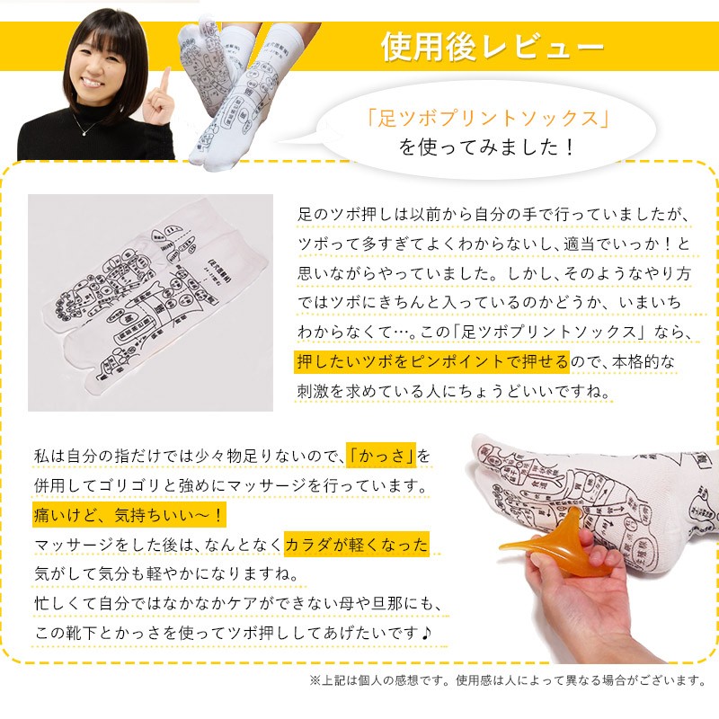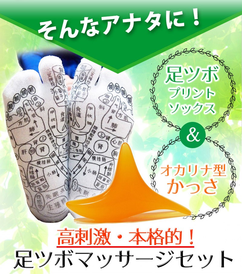 ━━━━━━━━━━━━ プリントソックス&かっさ 足つぼマッサージセット ━━━━━━━━━━━━ 毎日の健康は「足」から。 足の裏は多くの「ツボ」が存在することから、 「全身の縮図」とも言われています。 足ツボマッサージは昔から多くの人に 親しまれている、安全で手軽な健康法です。 ━━━━━━━━━━━━ 実は難しい!足ツボの位置 ━━━━━━━━━━━━ 足ツボは目に見えない上に、細かく密集しているため 正確な位置を把握するのが難しいんです! なんとなくでマッサージしたのはいいけど、きちんと 狙った場所を刺激できているのか不安…。そんな経験 ありませんか?かといってプロにお願いすると お財布に優しくないし…。 自分で上手にツボを押せる方法が あればいいのにな~。そんなことを考えているあなたにオススメなのが、「足ツボプリントソックス」! ━━━━━━━━━━━━ 足全体のツボが「見える」 プリントソックス ━━━━━━━━━━━━ 履くだけで足首・足の甲・足の裏など足まわりのツボがぜ~んぶ見える! セルフツボ押しはもちろん、家族やパートナーと 楽しくツボ押しするのにもちょうどいい靴下です。 フリーサイズですので、男女兼用でご夫婦・ご家族で一緒に使えます。(※足の大きさの目安は22~26cmです) ━━━━━━━━━━━━━━━━ イタ気持ちいい!オカリナ型かっさ ━━━━━━━━━━━━━━━━ 足ツボプリントソックスと「かっさ」を合わせて使うとさらにGOOD!3つの異なる突起を持つオカリナ型は力が入りやすく、手軽に「イタ気持ちいい」を体感できます。足だけでなく肩、首、二の腕、太ももなど、全身の気になる部分にご使用いただけます。 コンパクトで持ち運びに便利な手のひらサイズで、壊れにくく何度も使える素材です。 ━━━━━━━━━━━━━ 使い方はとってもカンタン! ━━━━━━━━━━━━━ 足ツボプリントくつしたを履いたら、 あとはかっさで気になる部分に該当する ツボを押すだけ!毎日できる足ツボ健康 法で、身も心も軽くしましょう! 足のツボ押しは時々自分の指で行っていましたが、足の ツボって多すぎてよくわからないし、適当でいっか!と 思いながらやっていました。しかし、そのようなやり方 ではツボにきちんと入っているのかどうか、いまいち わからなくて…。この「足のツボプリントソックス」 なら、押したいツボをピンポイントで押せるので、本格 的な刺激を求めている人にちょうどいいですね。 私は自分の指だけでは少々物足りないので、「かっさ」を 併用してゴリゴリと強めにマッサージを行っています。 痛いけど、気持ちいい~!! マッサージをした後は、なんとなくカラダが軽くなった 気がして気分も軽やかになりますね。 忙しくて自分ではなかなかケアができない母や旦那にも、 この靴下を使ってツボ押ししてあげたいです♪ ※上記は個人の感想です。使用感は人によって異なる場合がございます。 <足ツボプリントソックス 仕様> ■サイズ:フリーサイズ(22cm~26cmが目安) <オカリナ型かっさ 仕様> ■素材:蜜蝋樹脂 ■サイズ:長さ11.5×幅7×高さ3.5cm ■重量:60g |