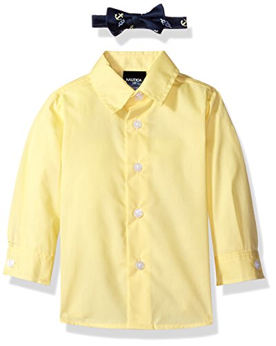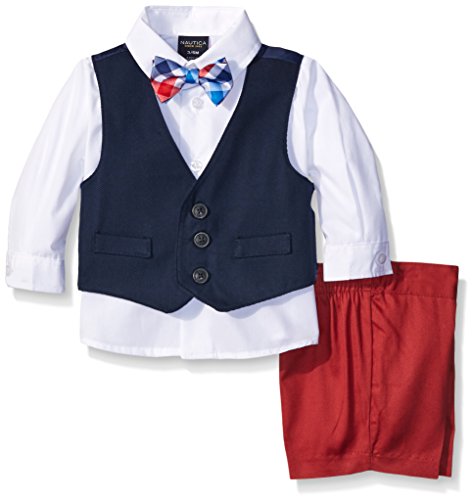 Nautica boys four piece twill vest set with vest, short, shirt and bow tie. Casual dresswear look perfect for special occasions.