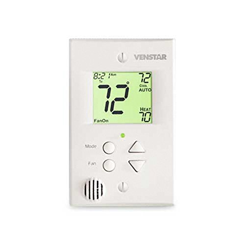-. Binding : Tools & Home Improvement -. Brand : Venstar -. Color : White -. Feature : One for All 2-stage heat, 2-stage cool for use with gas/electrics, heat pumps, electric & hydronic heat / Autochangeover - automatically switches between heating and cooling as needed / Thermostat-locking - set points can be adjusted only by authorized individuals when this feature is on / All programming and set points stored in non-volatile memory and are never lost in a power failure. LED indicator glows green or red to indicate cooling or heating / Mounting bracket included for easy drywall installation, or fits in 2" x 4" junction box. -. Model : T1100FS -. MPN : VST1100FS -. PackageQuantity : 1 -. PartNumber : VST1100FS -. ProductGroup : Home Improvement -. ProductTypeName : HOME_LIGHTING_AND_LAMPS -. Size : 2 X 4.7 X 6.3" -. Title : Venstar T1100FS FlatStat Thermostat