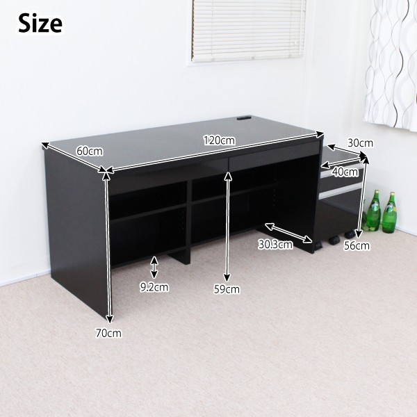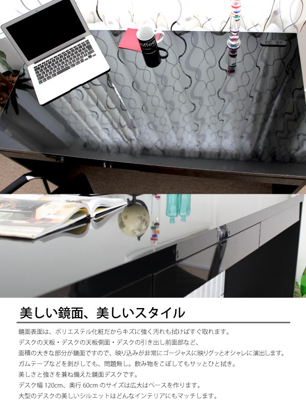 ■120cm幅ブラック鏡面デスク+2段チェスト