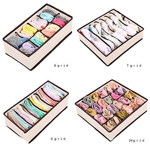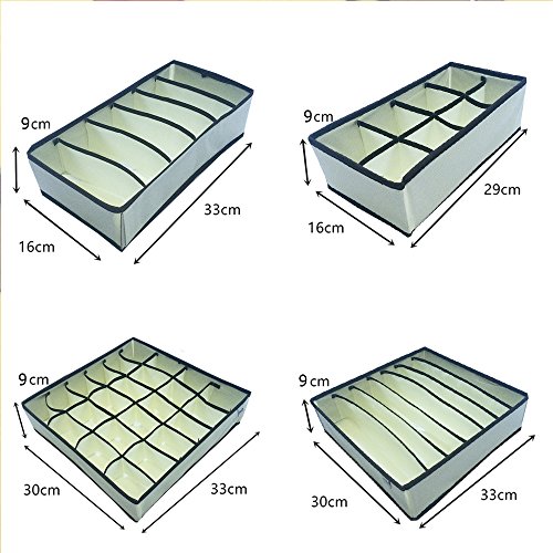 -. Feature : Package included: 6 cell *2 + 8 cell + 24 cell; 6 cell for under wears or ties: 33*16*9cm/13x6x3.5inch; 8 cell for socks: 28*14.5*9 cm/11x5.5x3.5inch; 24cell for scarves, socks or accessories: 33*30*9cm/13x12x3.5inch; 6 cell for bras: 39*30*10cm/15x12x4inch; / Material: The whole boxes are made of non-woven fabric, which is moth-proof, mould-proof, moisture-proof, and very durable. The removal square boards are made of PP (Polypropylene), which is high heat-proof, smooth and light / VARIED SIZE and flexible: There are 4 set of these boxes, 6 cell one for underwear; 8 cell one for socks, 24 cell one for scarves, accessories; another big 6 cell one for bras. Actually you could use these boxes to STORAGE EVERYTHING YOU LIKE / Removable Edge Layer - allows you to remove the edge pieces easily. It is foldable to be kept when not used / Classify underwear, socks, neck ties, scarves, bras, accessories etc. Easy to find which one you want to wear and never need to ransack all of your clothes. Reduce 50% of time for dressing or Searching. Have a nice day from there to begin for everyday