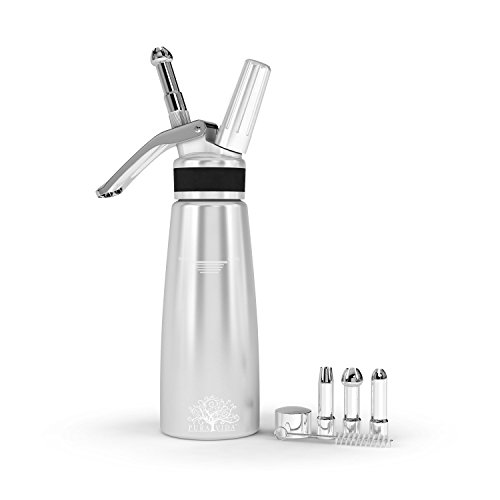 Whipped Cream Dispenser By Pura Vida – Durable, All Aluminum Body & Head – 3 Stainless Steel Decorating Tips & A Brush – Half Quartz Size – Dishwasher Safe – Gift Box Packaging – Easy Instructions