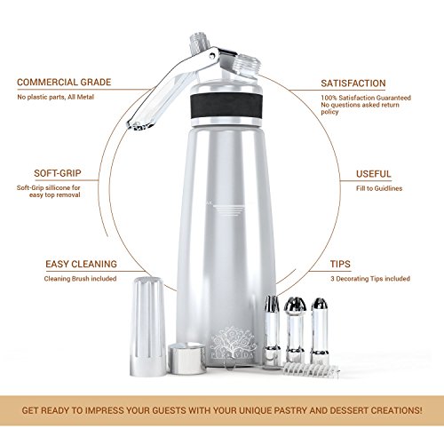 WHIPPED CREAM DISPENSER BY PURA VIDA - DURABLE, ALL ALUMINUM BODY & HEAD - INCLUDES 3 STAINLESS STEEL DECORATING TIPS & CLEANING BRUSH