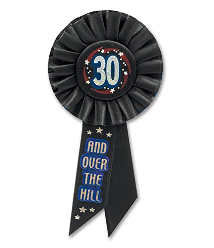 Studio : Party Central Publisher : Party Central Binding : Kitchen Product Description Black ribbons are perfect for honoring the special birthday person Each rosette reads "30 and Over The Hill" Ribbons are ideal for over-the-hill theme parties or celebrations Dimensions: 6.5"H x 3.25"W Material(s): fabric Pack includes 6 of the ribbon shown 0