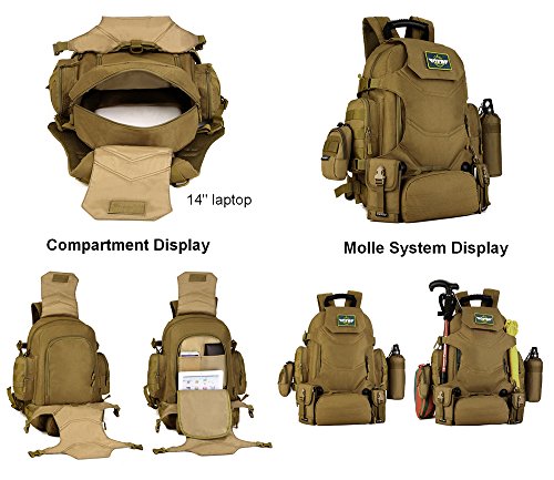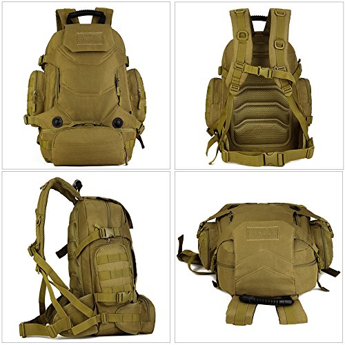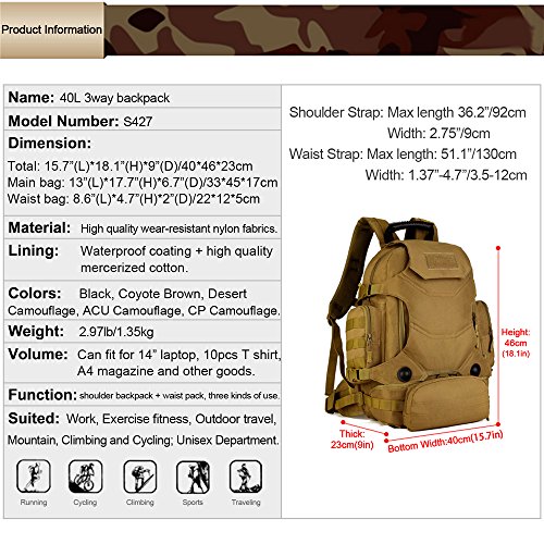 -. Feature : MATERIAL: 40L Capacity, Made of Water-resistant 900D Oxford fabric, make the military backpack have strong Waterproof performance and Anti-scratch wear resistance.Outer Material: High strength abrasion nylon;Inner Material: Waterproof Silky Cotton. / HANDY and DURABLE: Versatile 3-Way for carrying,backpack + Small Waist pouch, which is a nice add on that will come in handy at some point.The Waist pouch can be used seperately.Main compartment fits for 14" laptop,15 pieces T-Shirts and other gears. All the stitching and webbing, are used in military specification nylon material, longer straps slider, sleek, durable. / MOLLE SYSTEM: External expansion system designed to be used in combination with other equipment, you can load pockets, water bottle bag, accessory kits and other / FEATURES: 1.Versatile 3-Way for carrying 2.Detachable Small Waist pouch 3.The Velcro on the Rucksack, show your personality! 4.Thicker hand straps, Easy to hang 5.Thicker sandwich fabric,effectively reduce the weight, breathable and comfortable 6.Chest sliding adjustment system can quickly adjust to comfortable state,suitable for outdoor sports 7.Adjustable waist and sternum strap / FITTED: Suit for running, hiking, camping, hunting, cycling, shopping, photography,traveling, climbing, sport, go to school, tools bag and so on.