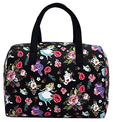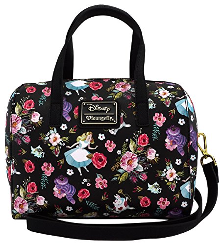 This Loungefly handbag features Disney's Alice in Wonderland characters in an allover floral print. There is Alice, the Cheshire Cat, the White Rabbit, teapots, mice, roses, and more. This is a boutique quality handbag with lots of great detailing. Made of Saffiano crosshatch textured vegan faux leather. Inside contains one large zip pocket and an open slip pocket large enough for most larger phones. Fully lined in striped wipeable material. Measures 9.25 inches wide, 10 inches high, 6 inch depth. 4 inch handle drop. Adjustable and detachable crossbody long strap measures 52 inches when fully extended. Shiny gold hardware.Feature