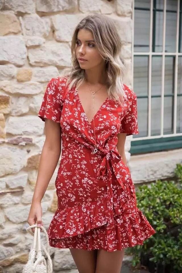 セクシー深Vネック花柄ミニワンピース レッドSML三サイズ