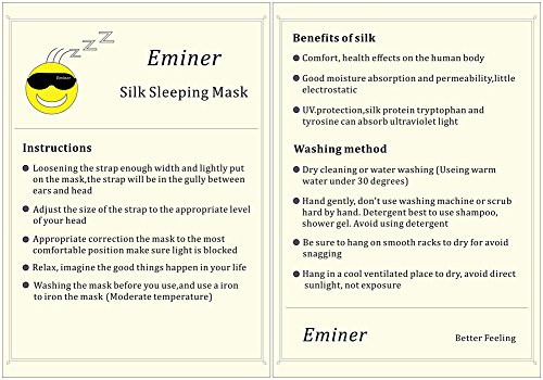 -. Binding : Misc. -. Brand : Eminer -. Feature : ★ COMFORTABLE & SOFT: The mask is made by pure silk,it's quite soft and comfortable,silk is the most considerate material for skin,stimulation coefficient of frictionand only 7.4%,the tape is very soft for ears,you will feel great when touch it. / ★ LIGHT & NATURAL: Only 0.52 ounces,you can't hardly feel any weight when you wear it,silk is natural material and environmental protection,beneficial and harmless to humans,silk have better feeling than satin and cotton. / ★ EXQUISITE SELECTION: Excellent material and workmanship for both mask and bag,exquisite black PU waterproof jewelry shrink bags,Strict select from many kinds of masks and bags.We are focus on high end sleep mask. / ★ SUITABLE FOR ANYBODY: Easy adjustable strap from 15.8inches to 27.6inches,suitable for Men/Women/Children,restrict all of the light entering.Natural material not oppression eye no fade or dyeing. / ★ 100% MONEY BACK GUARANTEE: We do hope our products are the best choose for you,and we are trying to do that,we guarantee unconditional refund in 60days for satisfaction guaranteed. -. Label : Eminer -. Manufacturer : Eminer -. PackageQuantity : 1 -. ProductGroup : Beauty -. ProductTypeName : BEAUTY -. Publisher : Eminer -. Studio : Eminer -. Title : Ultra Soft and Comfortable Eminer Sleep Eye Mask-Light Blocking Pure Silk Eye Cover with Exquisite PU Waterproof Shrink Bag and Easy Adjustable Size Soft Tape-No Dyeing Fade or Odor Travel Sleeping Mask-High Quality Day And Night Relaxation Sleep Mask Suit for Men Women Children-Satisfaction Guaranteed(Black)