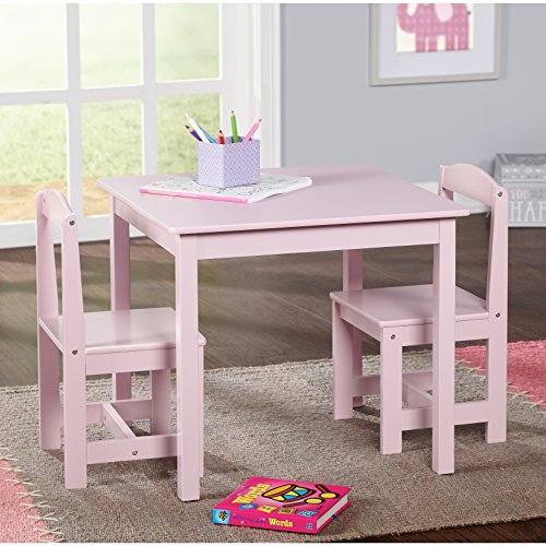 Product Description Let your children unleash their imaginations when they sit and play on the Hayden Kids' Table and Chair Set. It is an ideal choice for kids to enjoy arts and crafts projects. They can also read while sitting at this table or play with their favorite toys. Your kids can even host tea parties using this children's table and chair set. It is an adorable piece that has multiple uses. It will blend well in your child's room. The 3-piece table and chair set includes one table and two chairs and is available in various colors. The set is made from MDF and solid wood materials for lasting durability. The Hayden Kids' Table and Chair Set requires some assembly. Hayden Kids' 3-Piece Table and Chair Set - Pink : - Set includes: One table and two chairs - Materials: MDF, solid wood - Children's table and chair set is available in various colors - Table dimensions: 23.6"W x 23.6"D x 20"H - Chair dimensions: 11"W x 11.6"D x 22.25"H - Assembly required 0