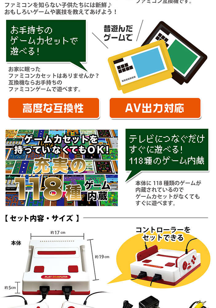 ●テレビに繋ぐだけですぐに遊べる!118種類のゲーム内蔵。ファミコンカセットを持っていなくても大丈夫!118 種類のゲームが内蔵されているのでファミコンカセットをお持ちでない方もすぐに遊ぶことができます。