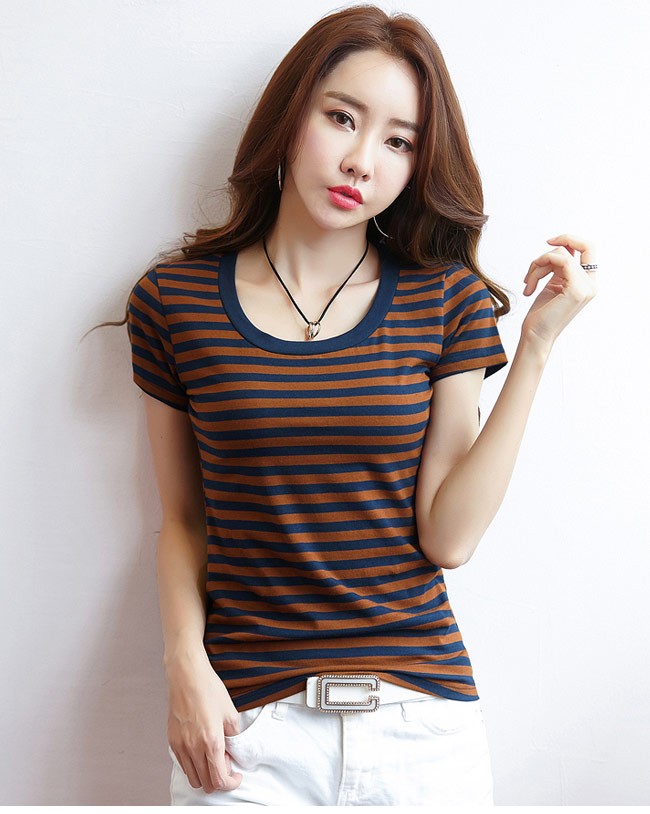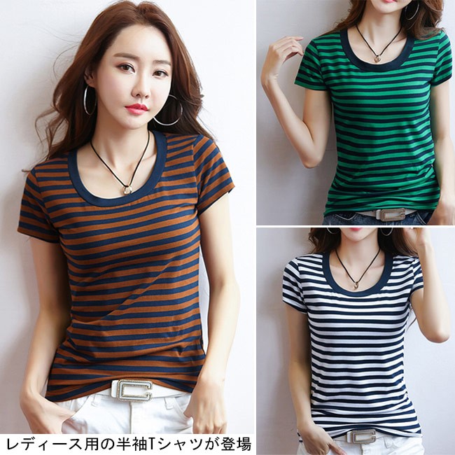 レディース用の半袖Tシャツが登場 吸湿性・通気性に優れた綿混紡素材を厳選、夏に最適な肌触りをもたらす ゆったりし過ぎずタイト過ぎずのサイズ感でとても美しいボディーラインを引き立てる 襟部分はラウンドネック仕様でカジュアル感がたっぷり 定番のボーダー柄デザインは爽やかなマリン風を取り入れ、季節感も溢れる パンツコーデにもスカートコーデにも似合い、ボトムス選ばずに着れる一枚 | |