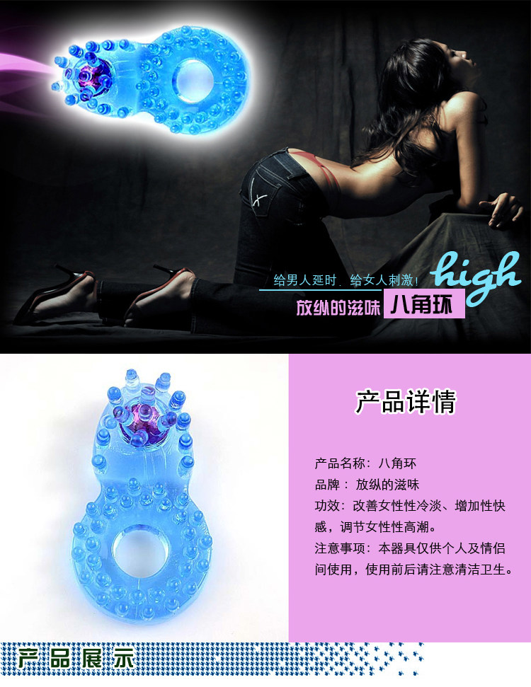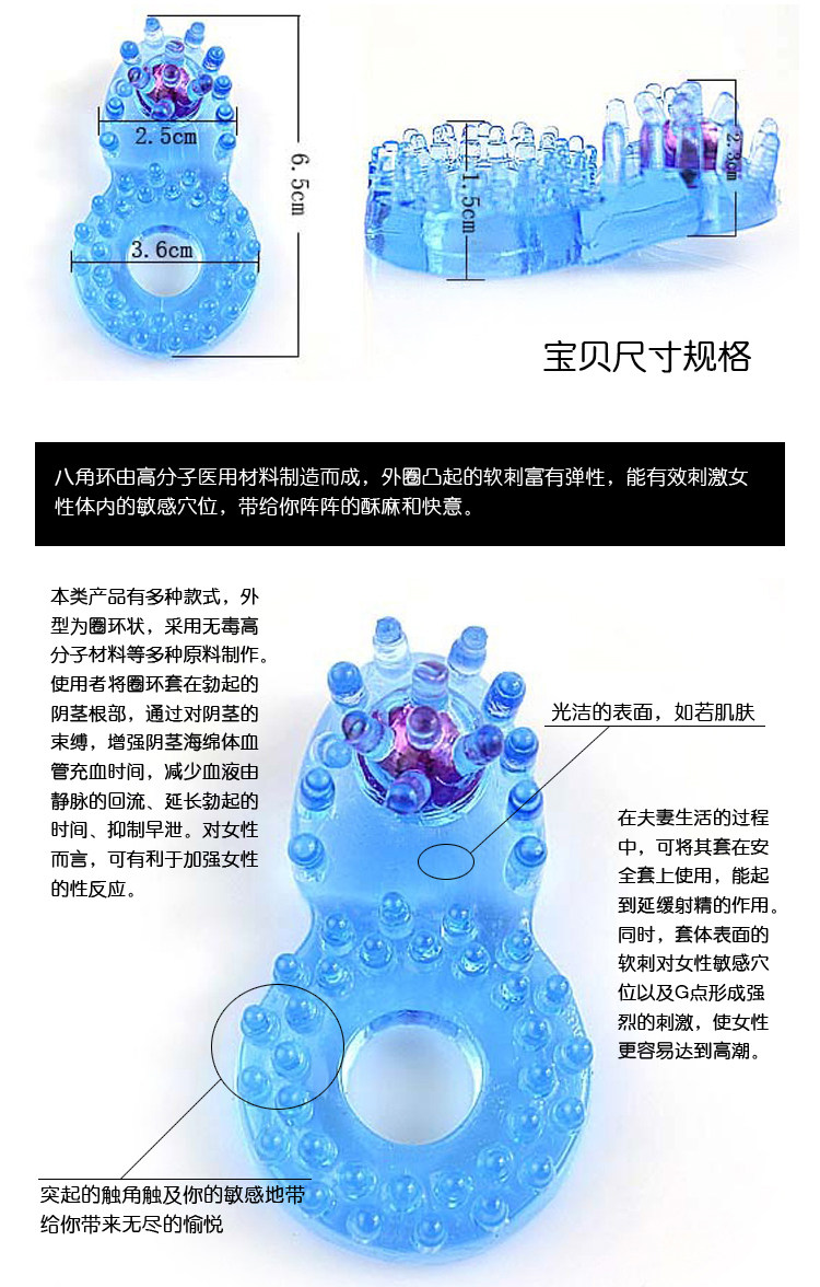 八角环由高分子医用材料制造而成,外圈凸起的软刺富有弹性,能有效刺激女性体内的敏感穴位,带给你阵阵的酥麻和快意。