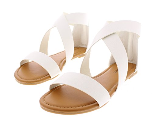 -. Feature : Stylish soft faux leather strappy open-toed flat sandals for women with back zipper for easy slip in and out wear. / Elegant crisscross straps wrap around the ankles for a gladiator style to make your legs appear long and beautiful. / Casual everyday summer ankle flats available in classic colors to pair with any outfit in your wardrobe. Choose from basic black, ultra white and pretty blush pink. / Lightweight design with lightly cushioned insole and non-slip rubber outsole for all day comfortable walking support. / These cute slip on fashion shoes are available in womens whole sizes 6, 7, 8, 9, and 10. If you are a half size, we recommend sizing up. For example, if you normally wear a woman's shoe size US 8.5 please order these on-trend crossover sandal flip flops for her in a size 9 for best comfort and fit.