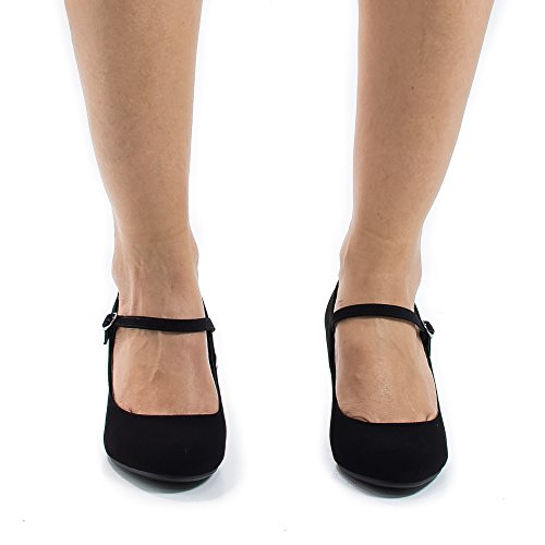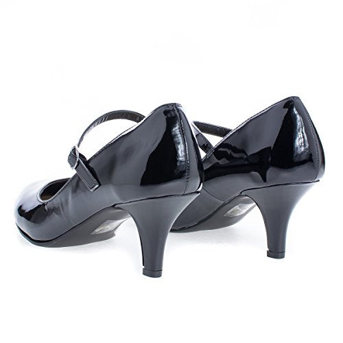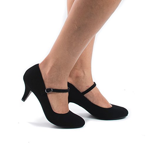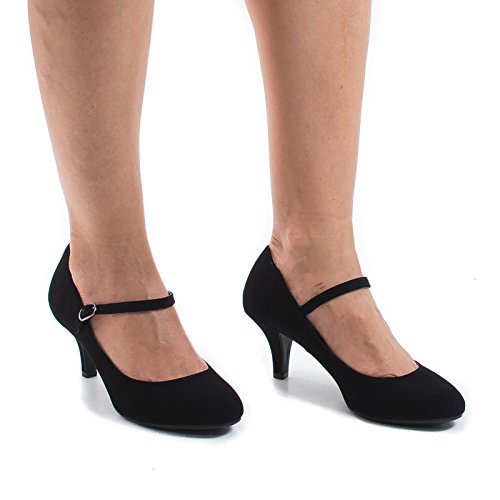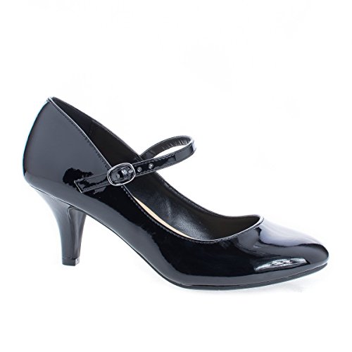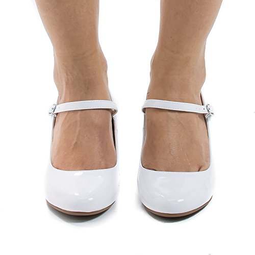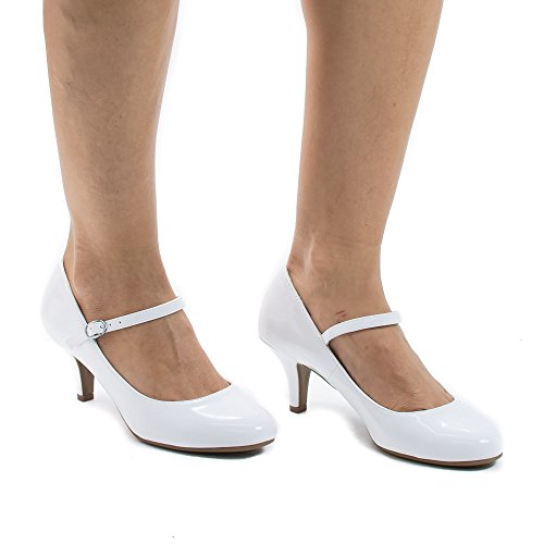 Product Description Walk in comfort and look classy in these round toe classic mary jane pumps, featuring a round toe, contrast stitching, an adjustable buckle strap, an extra padded insole for extra comfort, and an approximate 2.5 inch heel. (Please note that these measurements are based on a size 7). Available Black, White, etc. All man made materials. By Aquapillar. 0