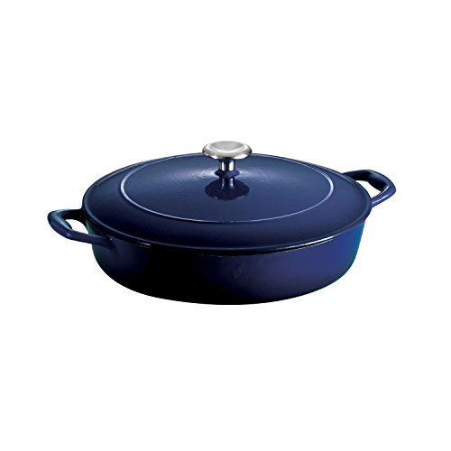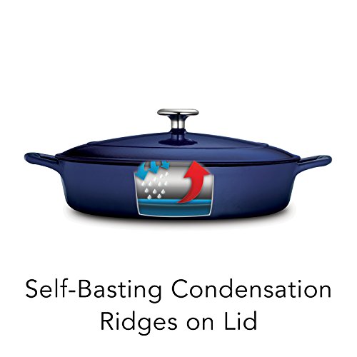 The enameled cast-iron 4 Qt covered braiser is part of Tramontina's Gourmet collection of premium products engineered and manufactured with the finest design, materials and workmanship, outperforming similar products within the market and delivering the best quality and value to the cooking professional and enthusiast alike. Prized by cooks for heat retention and even cooking, this enameled cast-iron 4-qt covered braiser comes in a vibrant, gradated porcelain enamel exterior finish offering an elegant kitchen to table serving option. The self-basting condensation ridges on lid uniformly collect and direct vapors onto food, producing moist and savory dishes making the braiser a perfect vessel for those slow cooking recipes, braised meats, baking dishes and even for frying. For added versatility the lid from the Tramontina Gourmet enameled cast iron 4 Qt covered braiser fits the 12-inch skillet from the same family perfectly! The heavy-gauge cast-iron covered braiser cooking surface is coated with off-white, smooth and easy-to-clean PFOA- and PTFE-free porcelain enamel and the sturdy side handles make handling a filled pan more manageable. Hand-wash only, compatible with all cooktops and oven-safe to 450 F. This product is assembled and packaged in USA and offered under a lifetime warranty.Feature