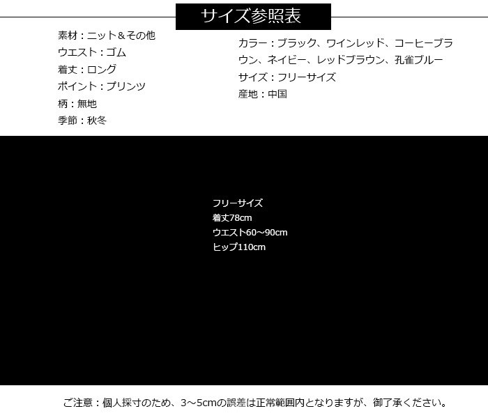 スカート ロング レディース スカート ハイウエスト マキシスカート 秋冬 フレアスカート 無地 大きいサイズ おしゃれ ロングカートレディース マキシス丈 スカート 秋 冬商品詳細素材:ニット&その他ウエスト:ゴム着丈:ロングポイント:プリンツ柄:無地季節:秋冬カラー:ブラック、ワインレッド、コーヒーブラウン、ネイビー、レッドブラウン、孔雀ブルーサイズ:フリーサイズ産地:中国サイズ参照表フリーサイズ着丈78cmウエスト60~90cmヒップ110cmご注意:個人採寸のため、3~5cmの誤差は正常範囲内となりますが、ご了承ください。スカート ロング レディース スカート ハイウエスト マキシスカート 秋冬 フレアスカート 無地 大きいサイズ おしゃれ ロングカートレディース マキシス丈 スカート 秋 冬