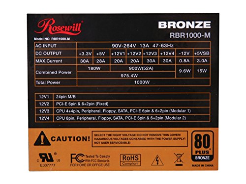 Rosewill RBR1000-M 1000-Watt Bronze Series 80 Plus Bronze Certified Power Supply compatible with Intel Core i7 and i5