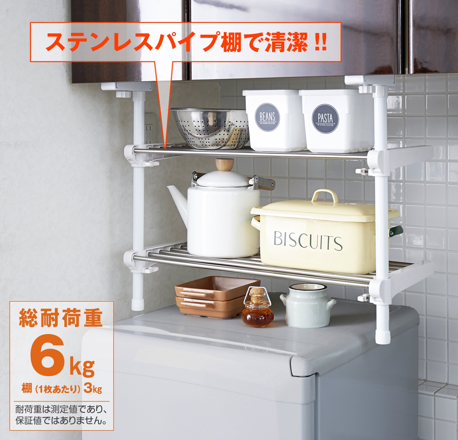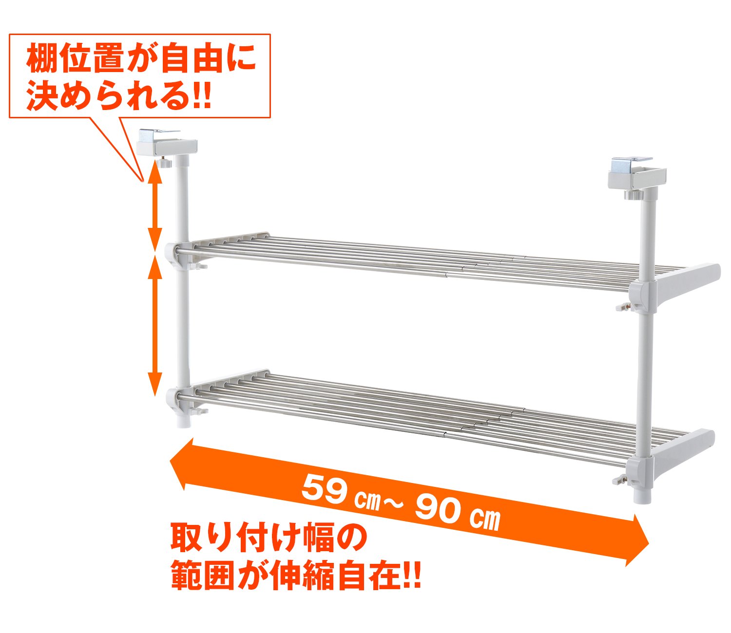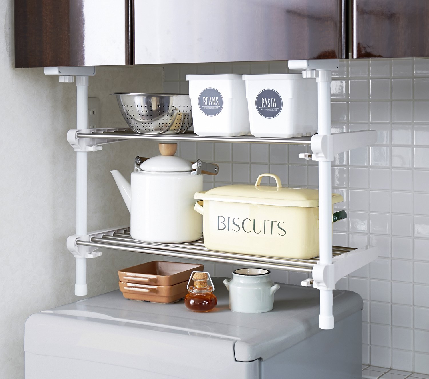 It is a two-stage hanging shelf that sandwiches and hangs it in the bottom plate of the existing cabinet.