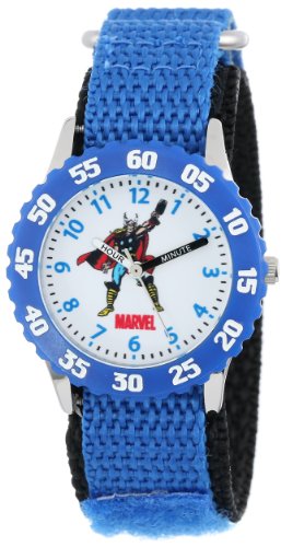 -. Binding : Watch -. Brand : Marvel -. Color : White -. Department : boys -. EAN : 0843231060531 -. Feature : Round Time Teacher Stainless Steel Watch with Marvel's Thor character on dial. / Meets or exceeds all US Govt requirements and regulations for Children's watches. / Recommended for Ages 3-7 years old. Includes a Time Teacher Punch Out clock for Parents to Teach their Children. / Accurate Japanese Quartz movement, scratch resistant mineral crystal, hook and loop Nylon strap / Water Resistant to 99 feet: withstands rain and splashes of water, but not showering or submersion. / 1 Year Limited Manufacturers Warranty -. Label : Marvel Comics -. Manufacturer : Marvel Comics -. Model : W000130 -. MPN : W000130 -. NumberOfItems : 1 -. PackageQuantity : 1 -. PartNumber : W000130 -. ProductGroup : Watch -. ProductTypeName : WATCH -. Publisher : Marvel Comics -. SKU : B005OVI3TU -. Studio : Marvel Comics -. Title : Marvel Kids' W000130 Thor Stainless Steel Time Teacher Watch -. UPC : 843231060531