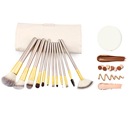 -. Title : 12 Pcs Makeup Brush Set,Premium Synthetic Cosmetic Brush Wood Handle with Leather Bag,Foundation Concealer Face Brush Kabuki Brush with Compact Cosmetic LED Mirror Champagne