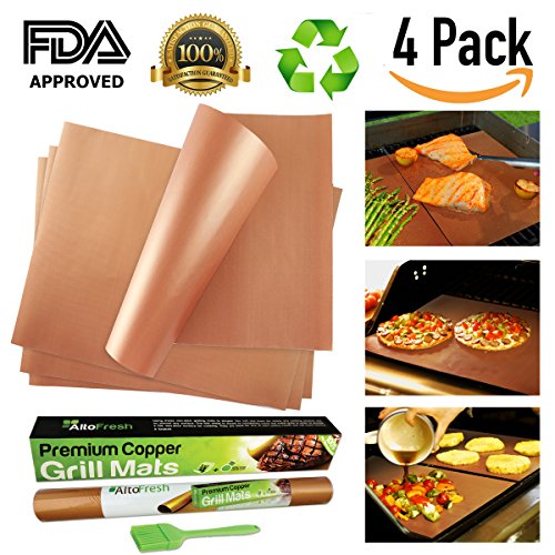 AltoFresh Copper Grill & Bake Mats with Silicone Oil Brush Set of 4 | Best Non-stick, Easy to Clean, Reusable Grill Mats | Great for BBQ Grilling & Baking on Gas, Electric, and Charcoal Grills